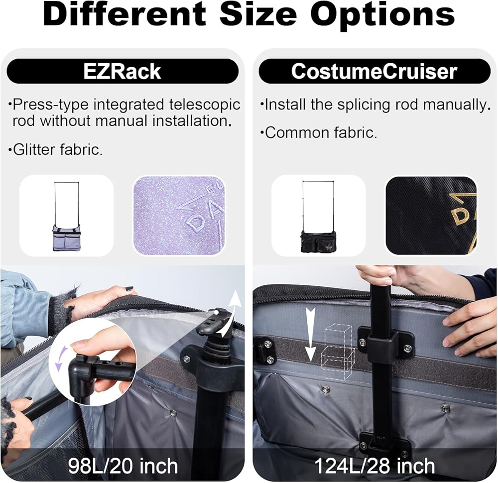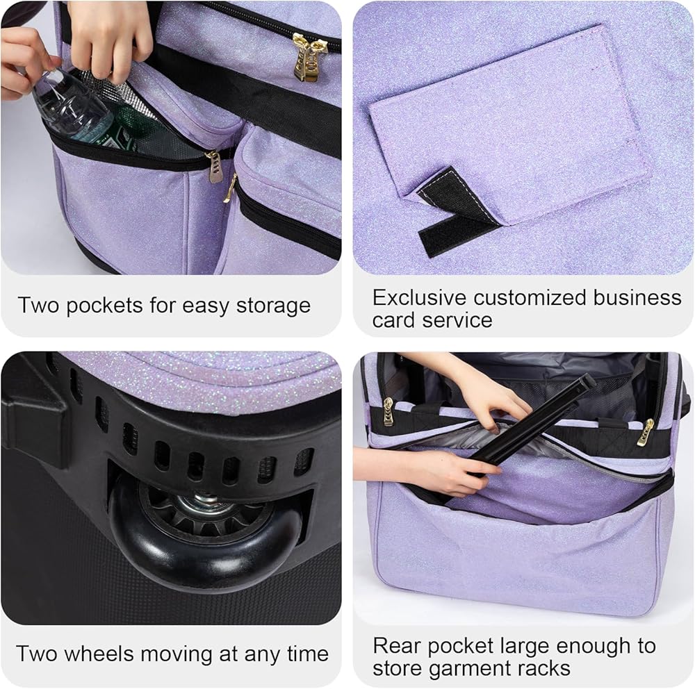 سهل الاستخدام وجاهز للسفر - إعداد سريع دون الحاجة إلى أدوات. تتميز بأشرطة يد قوية وتصميم بعجلتين لسهولة النقل. نسيج مقاوم للماء يضمن بقاء الأزياء واللوازم آمنة وجافة، والأداء بعد الأداء.