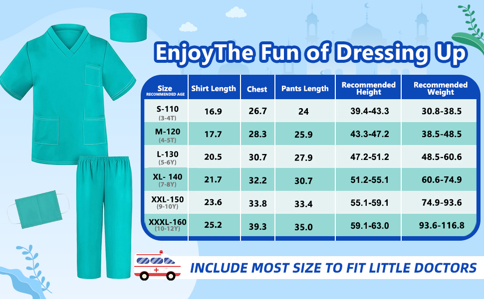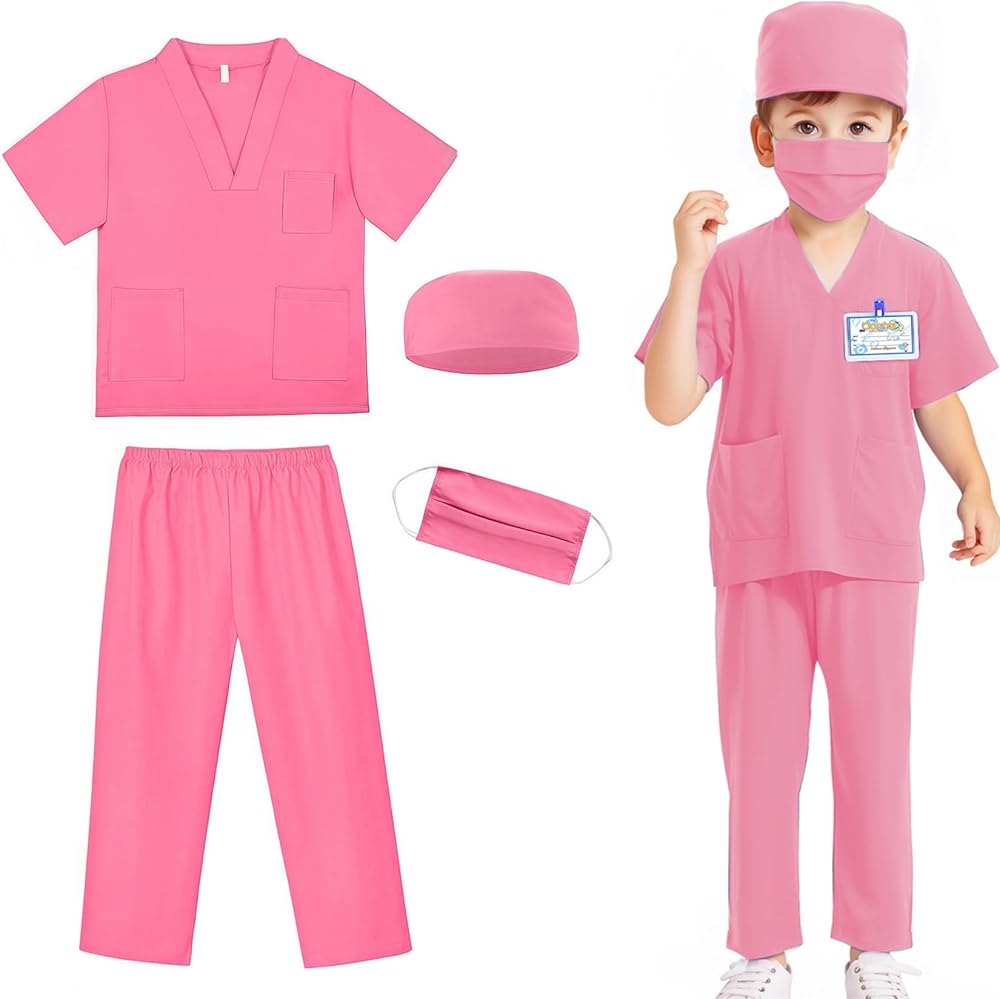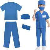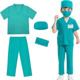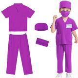 [Doctor Scrubs 5pcs Valuable Set]--This doctor scrubs set includes a top, a pair of scrub pants, a surgical mask, a hat,and a doctor name tag.The costume are made of soft fabric for kids fragile skin,give children a comfortable wearing experience.