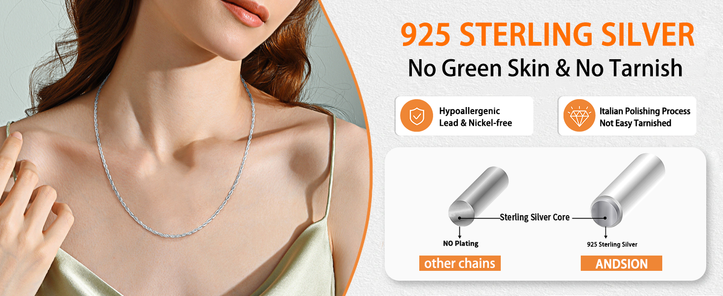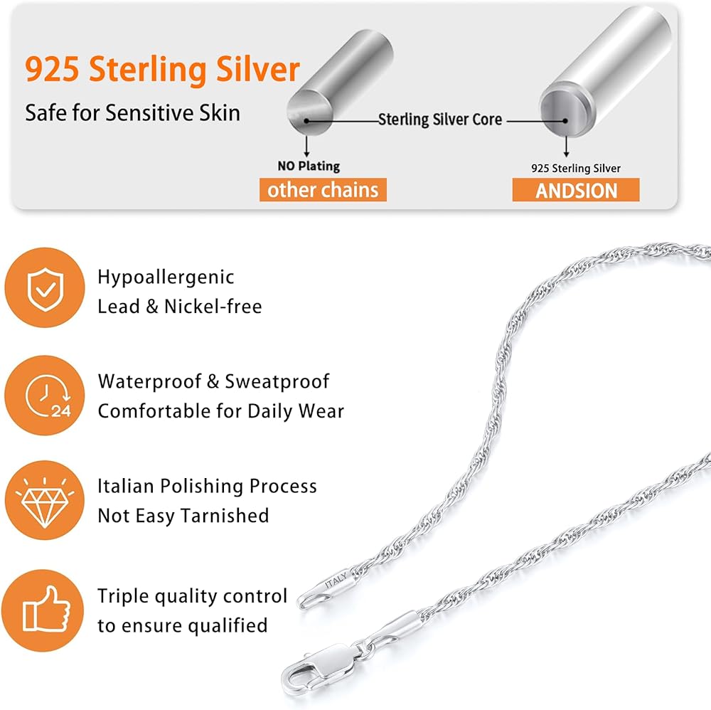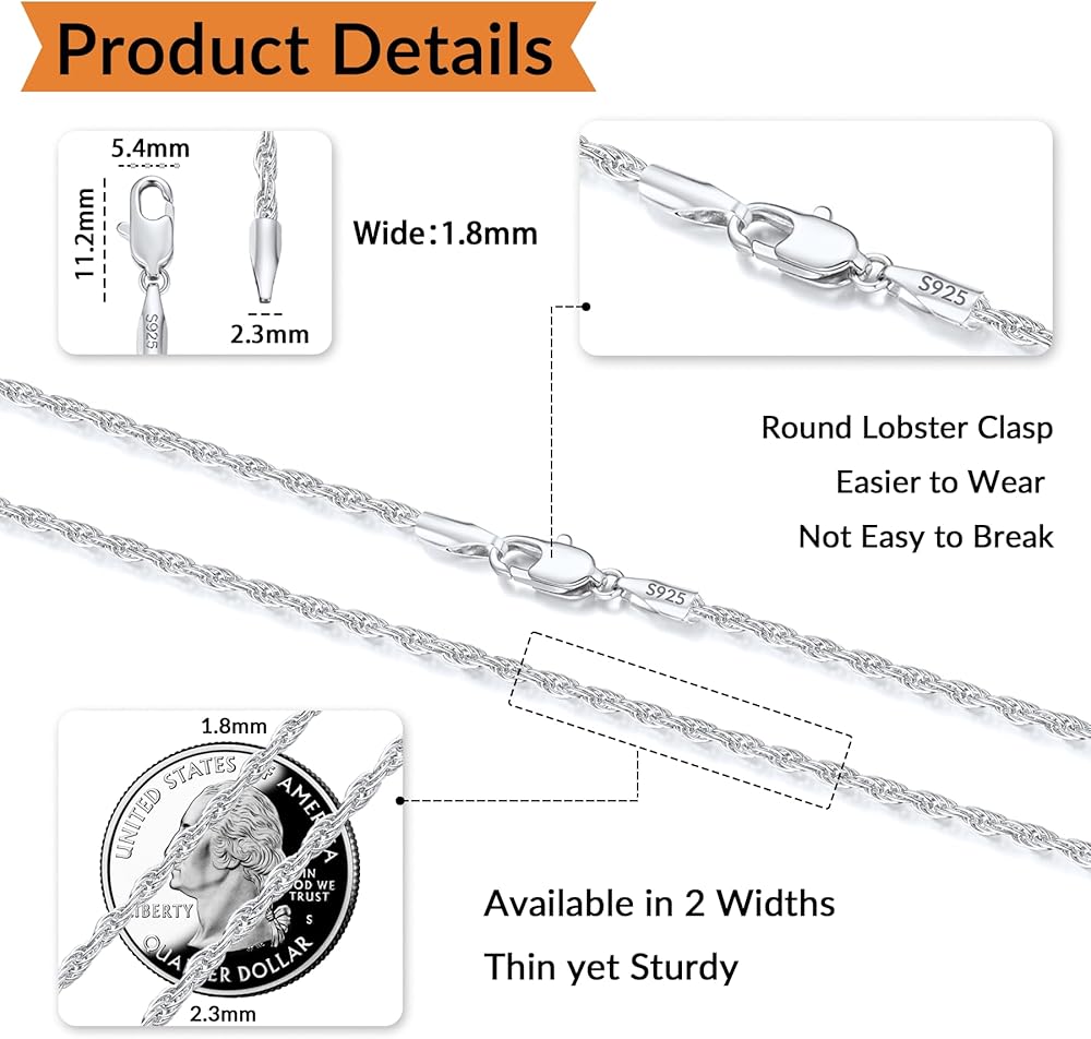 قوية ومتينة: تم تصميم هذه القلادة المصنوعة من الفضة الإسترلينية للسيدات لتدوم طويلاً، وتوفر القوة والموثوقية مع الحفاظ على لمعانها وجذابها. قلادة السلسلة الفضية لا تفقد بريقها ولا تسبب الحساسية، مما يجعلها مثالية للارتداء اليومي دون التسبب في تهيج الجلد أو تغير لونه. خفيف الوزن وخالي من التشابك، ويوفر جودة وراحة ثابتة.