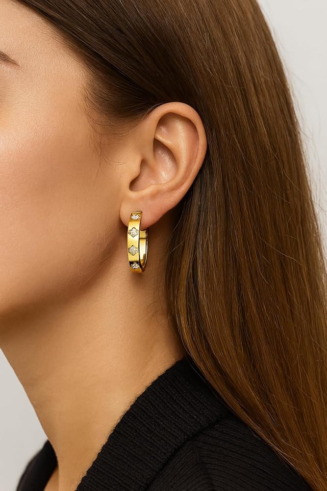 Bring sparkle and personality to your style with these CZ hoops in a gold tone finish. Designed with delicate flower details, these fun hoops combine timeless elegance with a bohemian twist. Lightweight and hypoallergenic, they're perfect for everyday wear or dressing up for special occasions. Whether you're looking for unique jewelry for women, bohemian fashion accessories, or a stylish gold hoop with flowers, these versatile hoops are a must-have addition to your jewelry collection.