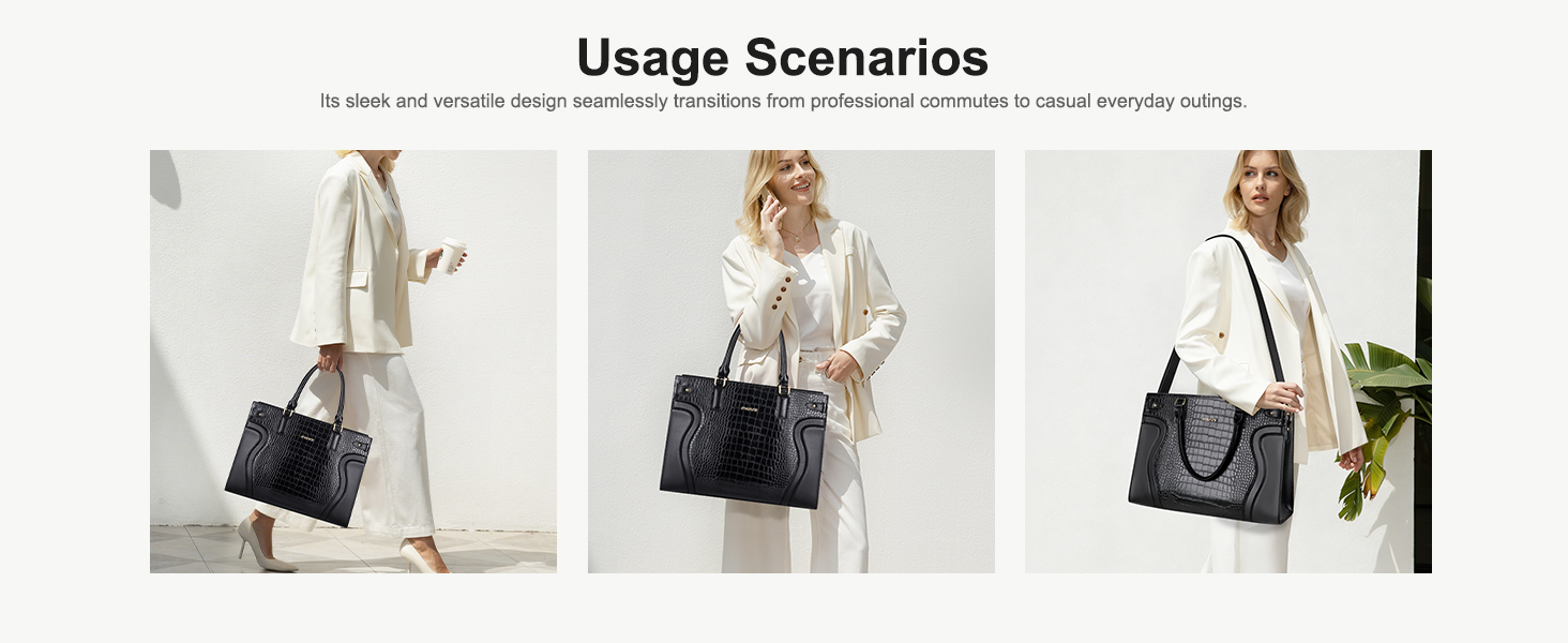 تصميم أنيق ومراعاة. يمكن للمقصورتين الجانبيتين الأخريين وحقيبة الحقيبة الصغيرة ذات الألوان المطابقة تخزين المجوهرات والهاتف المحمول والمفاتيح والفأرة وجوازات السفر وبطاقات الائتمان والنقود والمكياج وما إلى ذلك. تعتبر حقيبة حمل الكمبيوتر المحمول الأنيقة هذه مثالية للاستخدام اليومي في التسوق، والمكتب، ورحلات العمل، والعمل، وعطلات نهاية الأسبوع، والأنشطة الخارجية، والعطلات الخارجية، والسفر، وصالات الألعاب الرياضية، والتخييم، إلخ. حجم جميل يناسب النساء والكبار بشكل رائع.