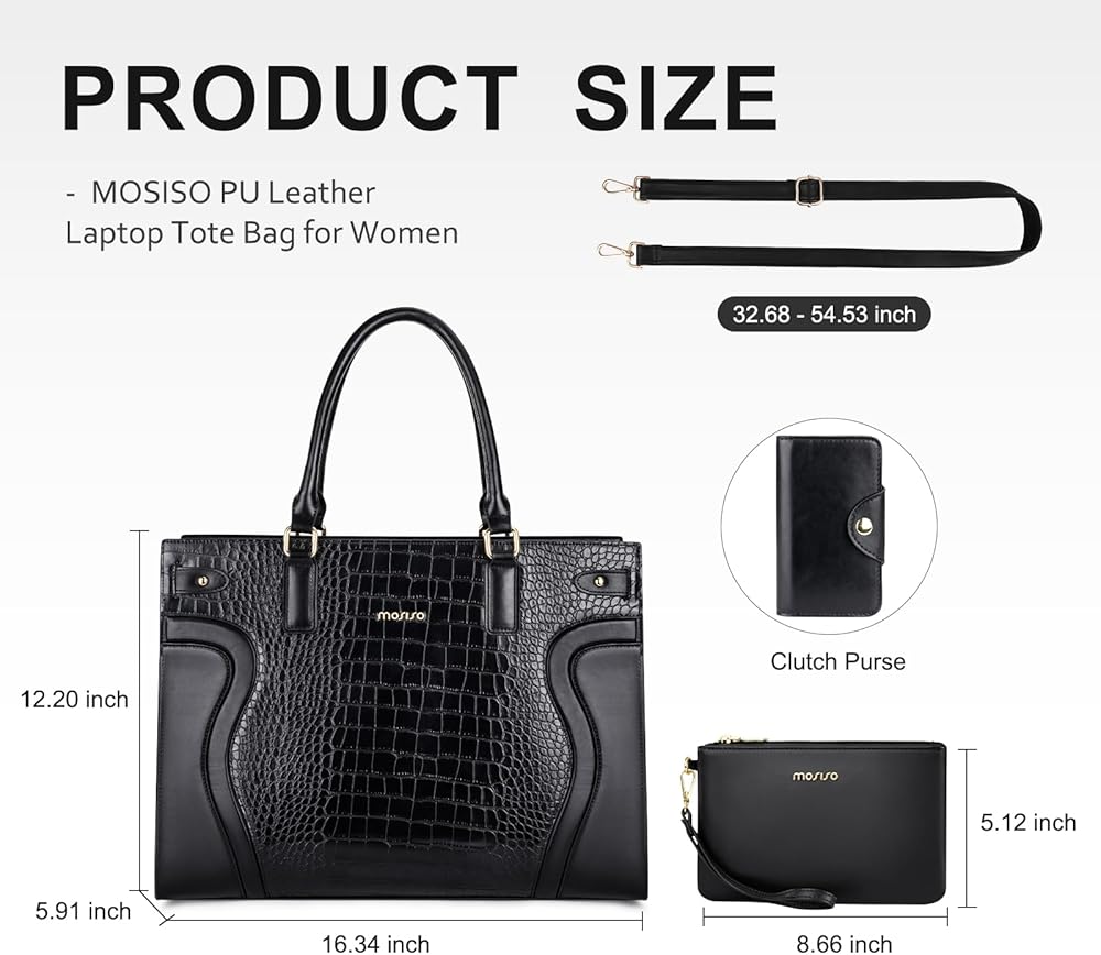 الأبعاد الداخلية: 14.96 × 10.43 × 5.91 بوصة (الطول × العرض × الارتفاع)؛ الأبعاد الخارجية: 16.34 × 12.20 × 5.91 بوصة (الطول × العرض × الارتفاع). أبعاد محفظة القابض الصغيرة: 8.66 × 5.12 بوصة (الطول × العرض). أبعاد الجيب الخلفي: 7.48 × 6.3 بوصة (الطول × العرض). تتميز حقيبة اليد الاحترافية هذه بحقيبة كمبيوتر محمول مبطنة مع حماية ممتازة، وواسعة بما يكفي لجهاز كمبيوتر محمول مقاس 15.6 بوصة وجهاز iPad مقاس 12.9 بوصة.