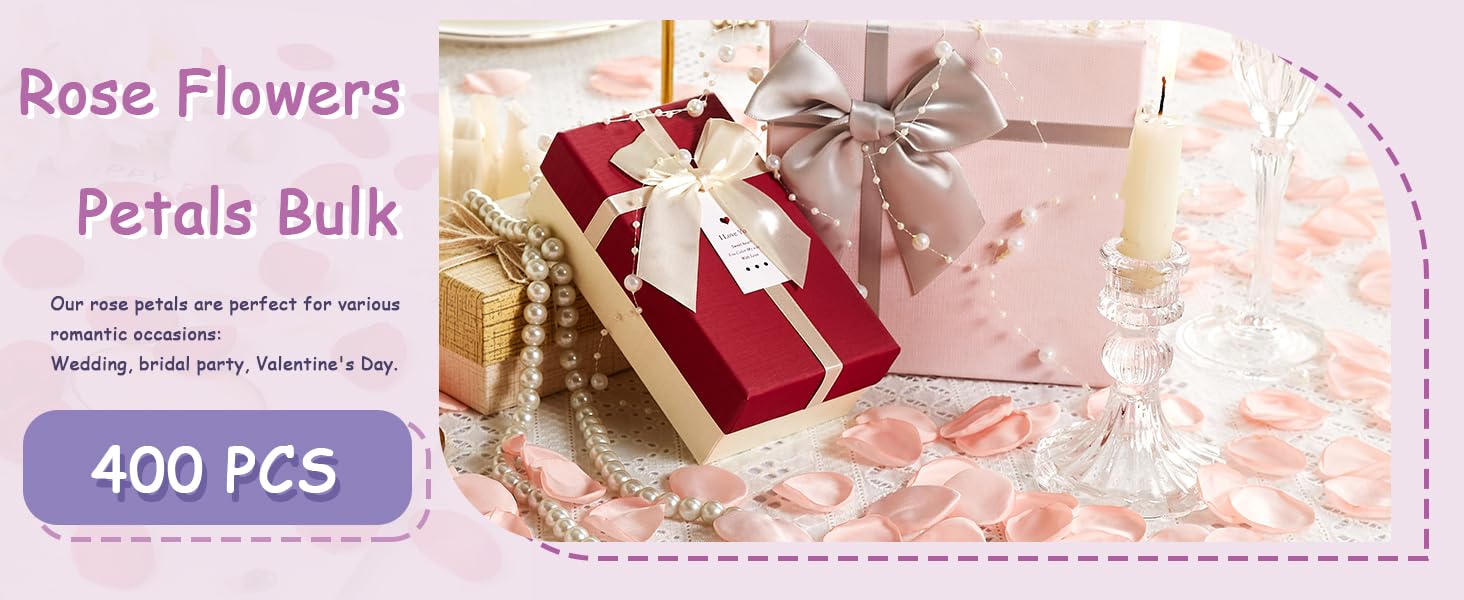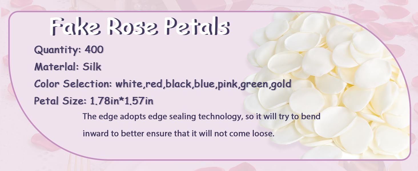 مجموعة بتلات الورد: يحتوي كل صندوق على 400 بتلة ورد صناعية، يبلغ قياس كل منها حوالي 1.57-2 بوصة (اختلاف طفيف بسبب الانحناء الطفيف للبتلات). لا يتلاشى أبدًا ويدوم إلى أجل غير مسمى.