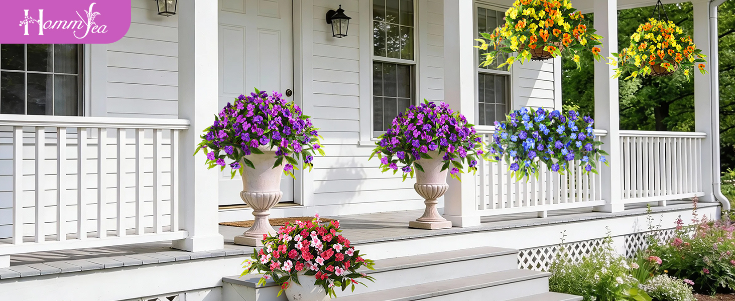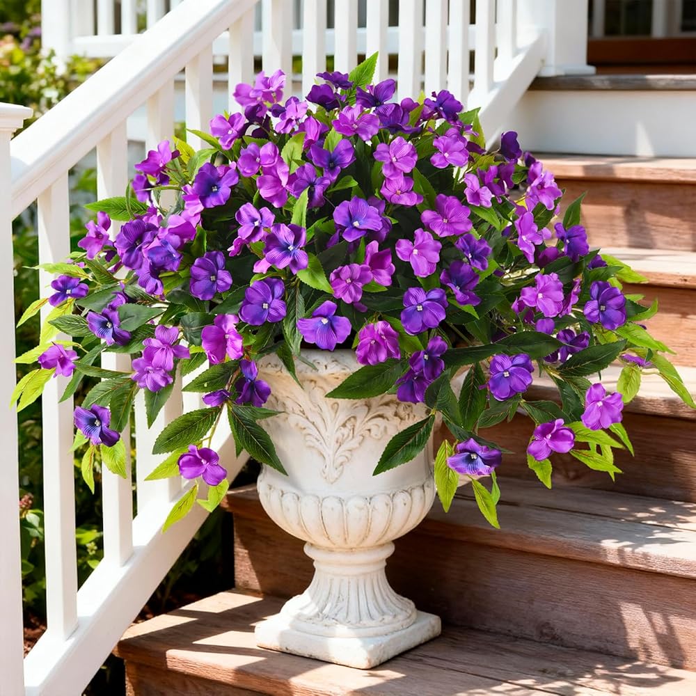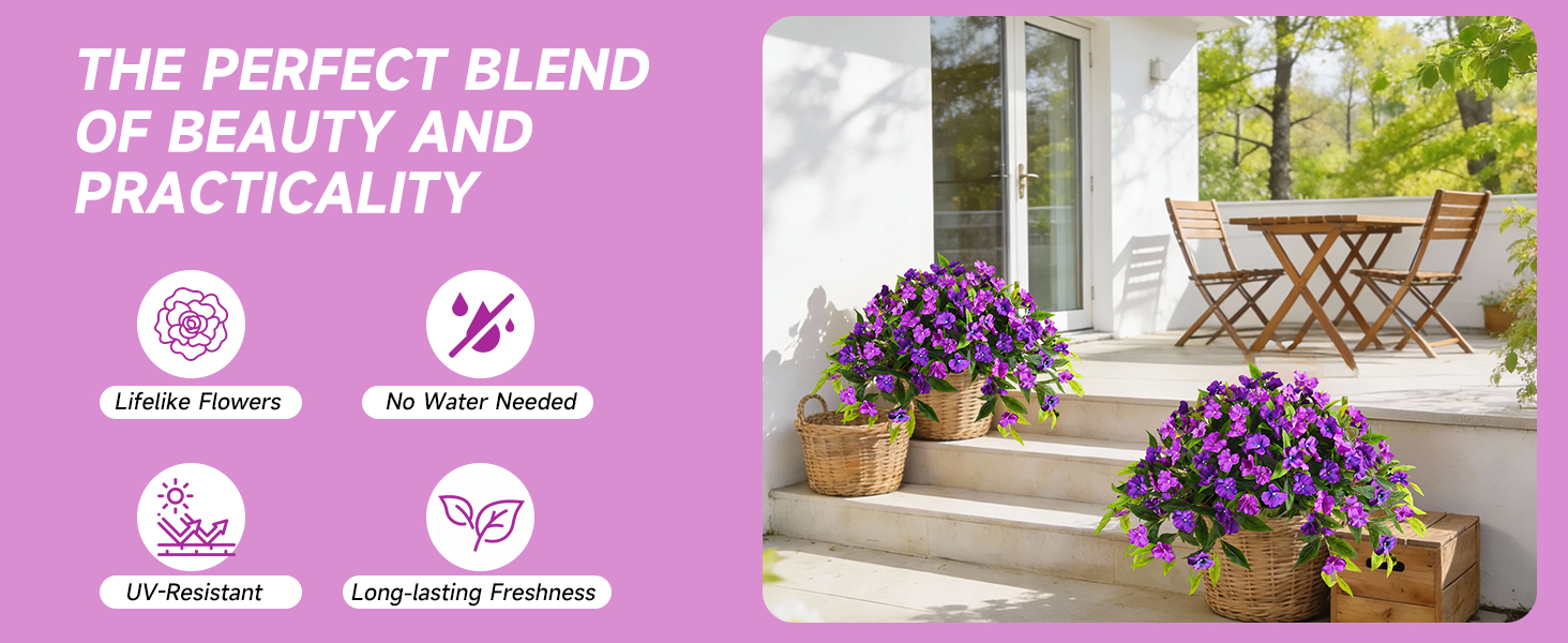 زهور صناعية طازجة دائمًا في الهواء الطلق: لا حاجة للري أو التقليم أو مكافحة الآفات. تظل هذه الزهور البلاستيكية نابضة بالحياة موسمًا بعد موسم دون الحاجة إلى صيانة، مما يجعلها مثالية للأسر المزدحمة أو أي شخص يقدر الزهور طويلة الأمد.
