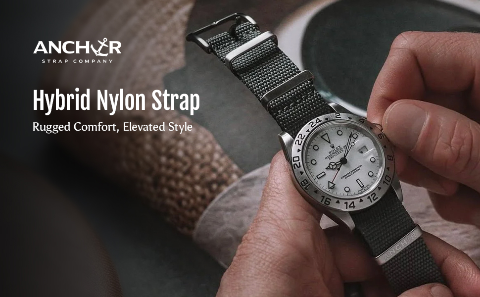 Anchor Strap Co's Hybrid Nylon Watch Strap blends rugged construction with breathable comfort in a refined basketweave design. Crafted from a durable nylon and cotton blend, it offers enhanced airflow, structure, and long-wearing softness. The sliding floating keeper allows for a customizable fit on a wide range of wrists, while the brushed stainless steel square buckle provides strength and style. At 1.3mm thick and 300mm long, it fits wrists from 5.75 to 8.5 inches, offering a reliable upgrade for most 22mm analog watches. Heat-sealed notches prevent fraying and maintain structure over time, while the subtle “HOLD FAST” engraving adds a personal, motivational touch. Designed to adapt, this strap is ideal for everything from rugged exploration to refined everyday use. Whether you're in the city or on the trail, the Anchor Hybrid Nylon Strap delivers breathable performance and reliable support with visual depth and thoughtful details.