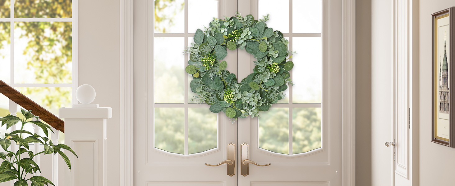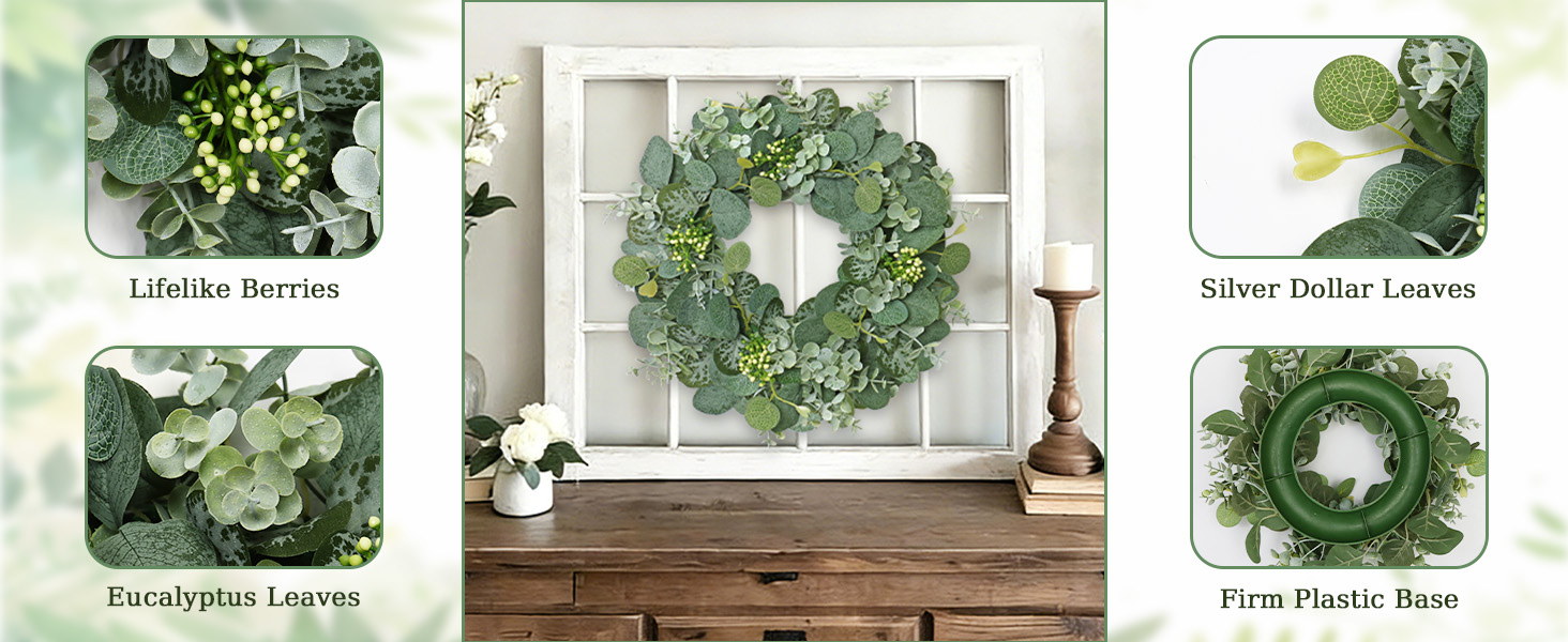 • 【مواد عالية الجودة】إكليل الباب الأمامي الأخضر مصنوع من قماش حريري وأوراق الأوكالبتوس البلاستيكية المقلدة، بناءً على الكروم الطبيعية. الألوان المريحة والأشكال الطبيعية النابضة بالحياة تمنح الناس شعورًا فنيًا ورومانسيًا، مما يمكن أن يجلب جوًا لطيفًا لمنزلك.