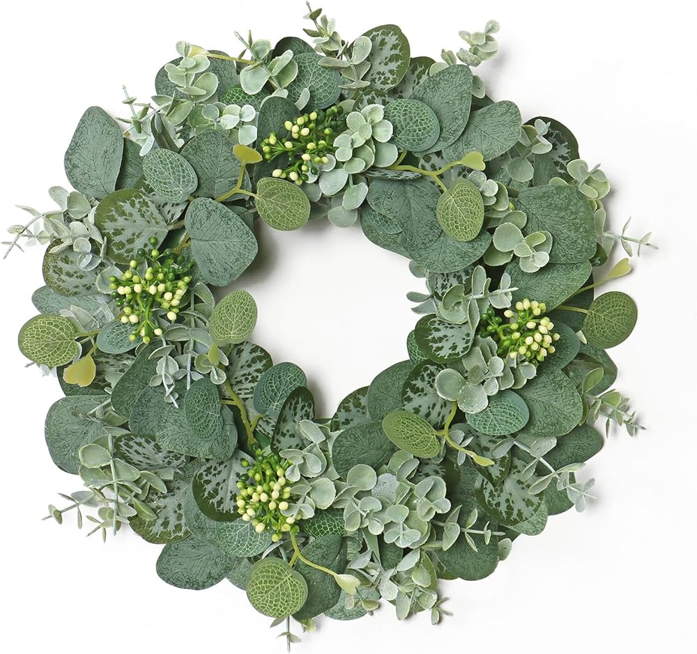 إكليل الأوكالبتوس الأخضر للباب الأمامي 14 بوصة إكليل من الخضرة للربيع والصيف مع التوت أكاليل الأبواب طوال الموسم ديكور أكاليل الأوكالبتوس الاصطناعية للأماكن الداخلية والخارجية ونافذة الحائط وحديقة المزرعة