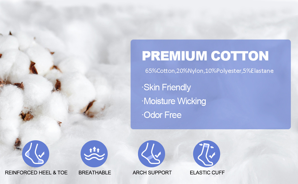 [Premium Cotton Mens Socks] [Premium Cotton Mens Socks] Premium mens crew socks offer superior comfort with a 65% premium cotton blend for softness and breathability. Reinforced with 20% nylon and 10% polyester for enhanced durability, plus 5% elastane for a secure, flexible fit. Available in two precise sizes to ensure perfect comfort: Standard (US Shoe Size 9-12, Sock Size 10-13) and Extra Large (US Shoe Size 13-15, Sock Size 13-16).