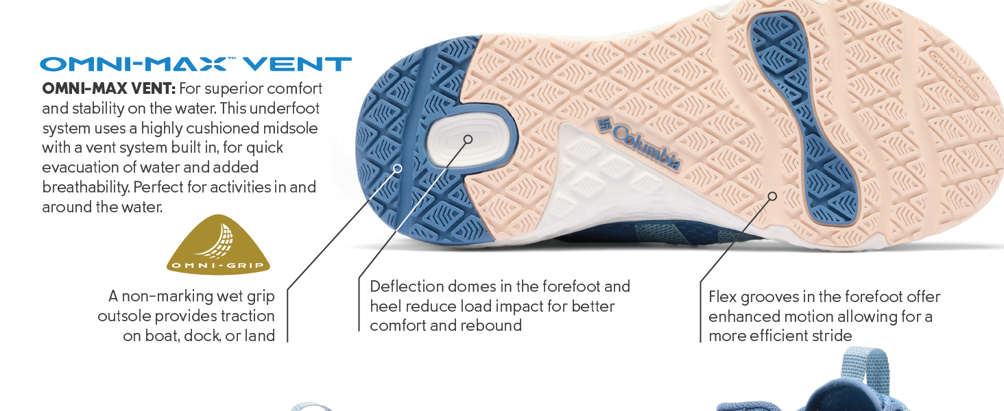 OMNI-MAX VENT: For superior comfort and stability on the water. This underfoot system uses a highly cushioned midsole with a vent system built in, for quick evacuation of water and added breathability. Perfect for activities in and around the water.