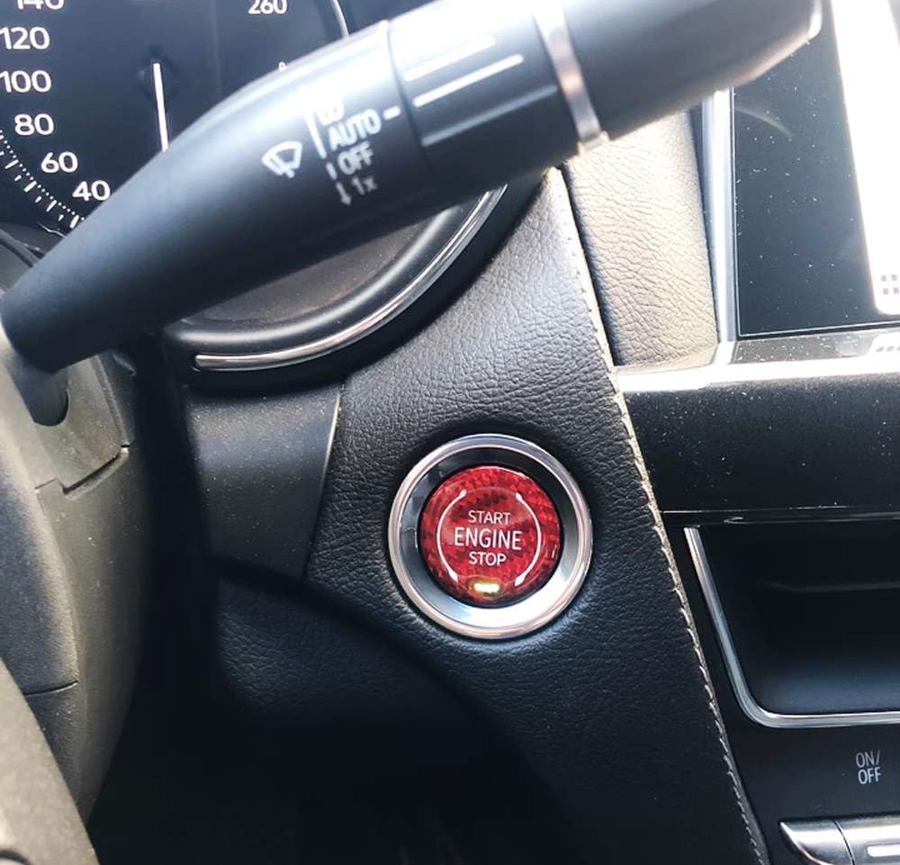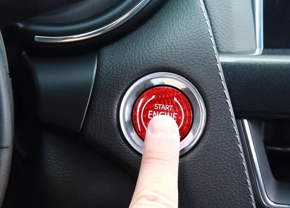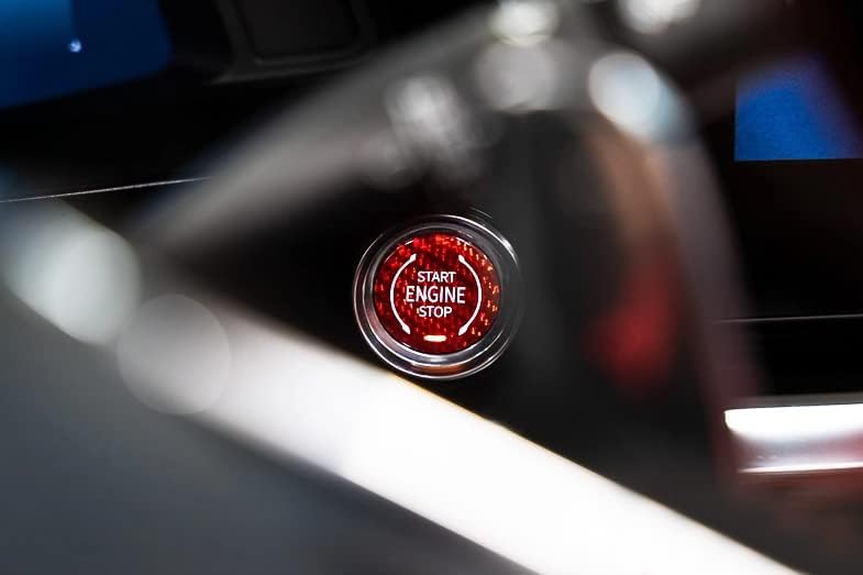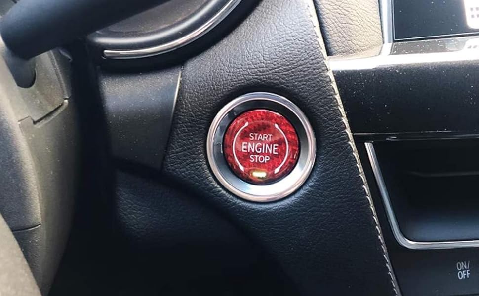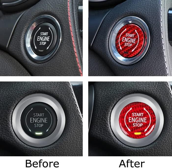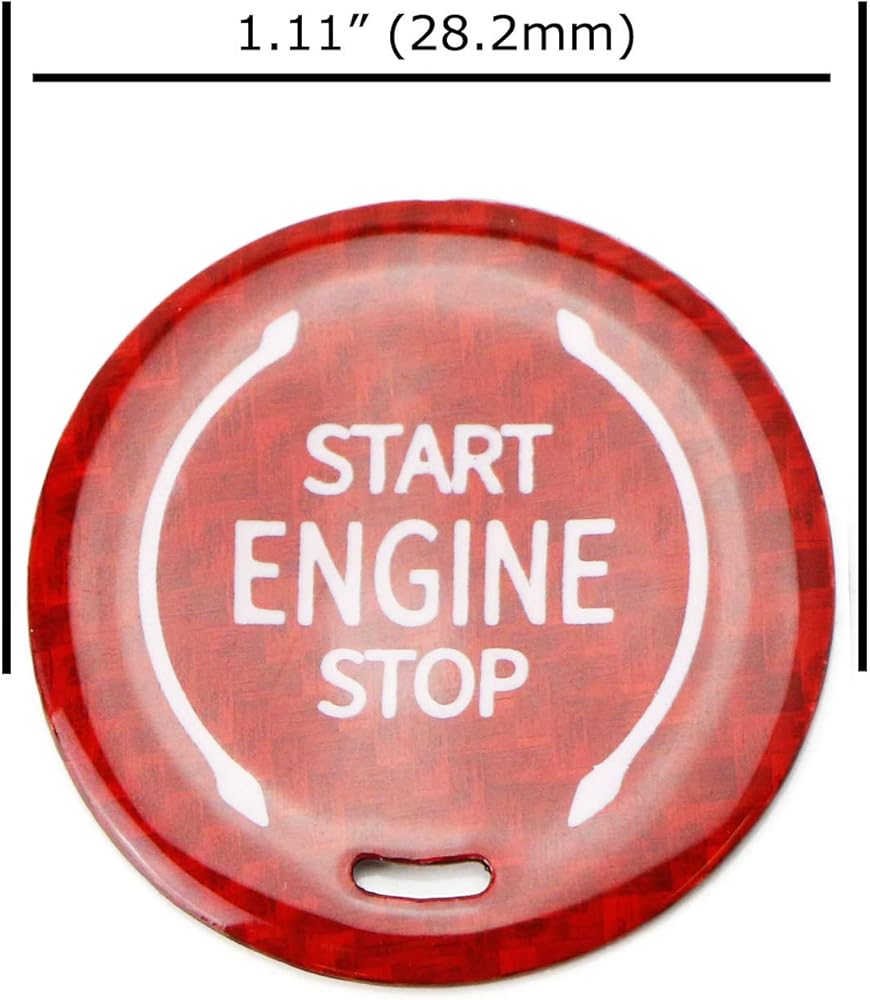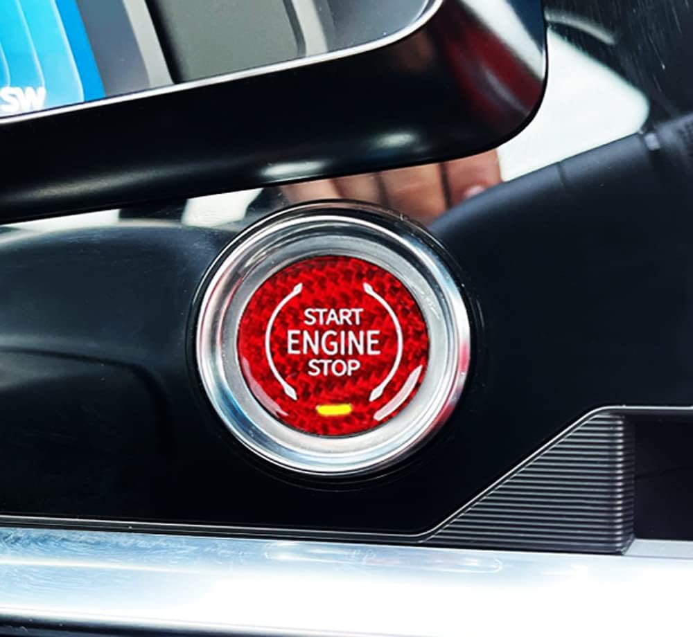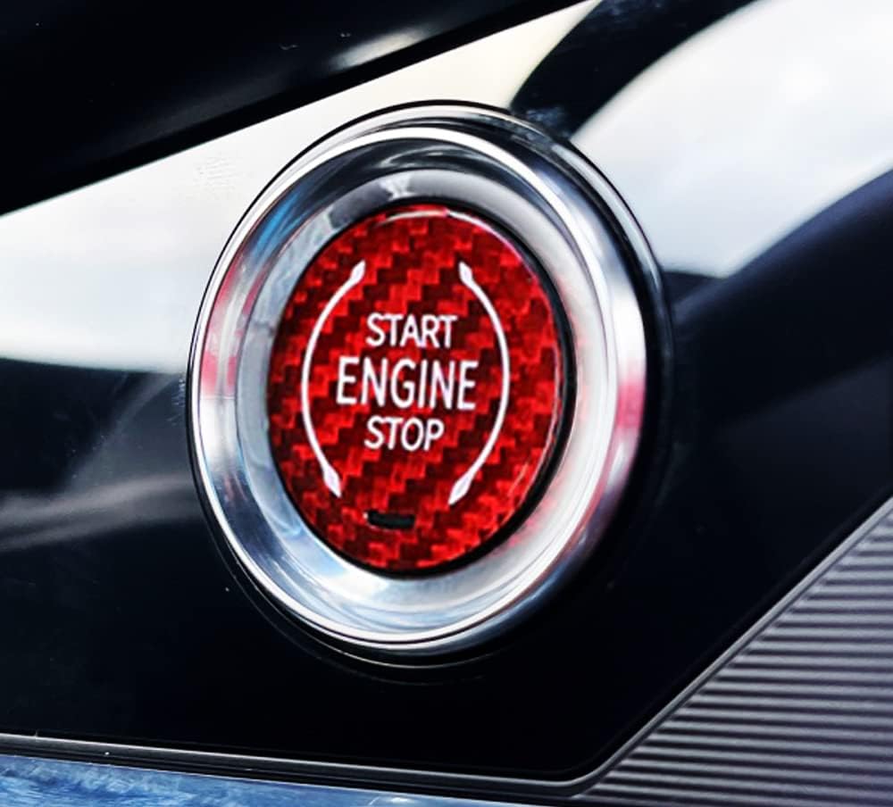 لمسة نهائية حمراء لامعة مصنوعة يدويًا من مادة ألياف الكربون المنسوجة الأصلية مع حروف/رمز طباعة الشاشة "ENGINE START STOP"، ومغطاة بطبقة واقية من الأشعة فوق البنفسجية، وشريط ذاتي اللصق على الوجهين على الظهر