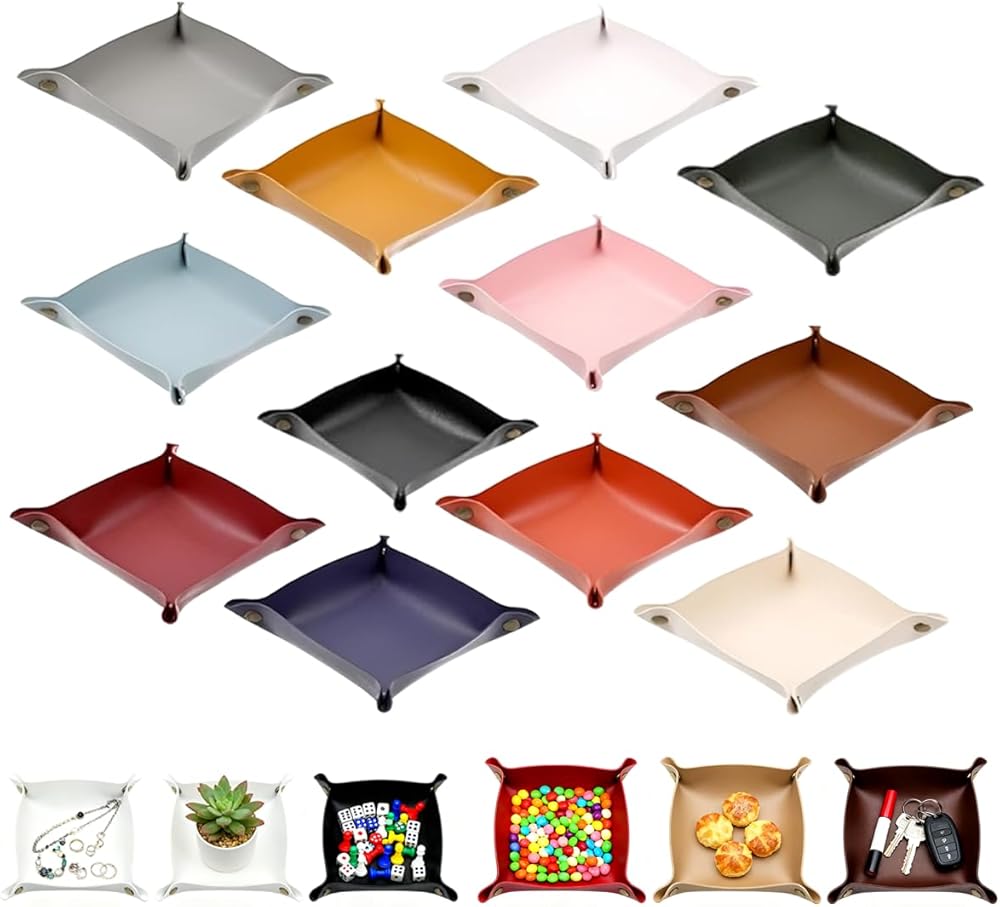 • Value Packed Set:This 12 piece leather valet tray collection features compact dimensions (Product dimensions 7.87x7.87x0.08 inches,Installation dimensions 6.57x6.57x1.38 inches). Offered in 12 versatile hues including white, black, red, yellow, green, blue, brown, orange, pink, grey, sky blue, and off white ,ideal as daily key trays or stylish replacements for any valet station.