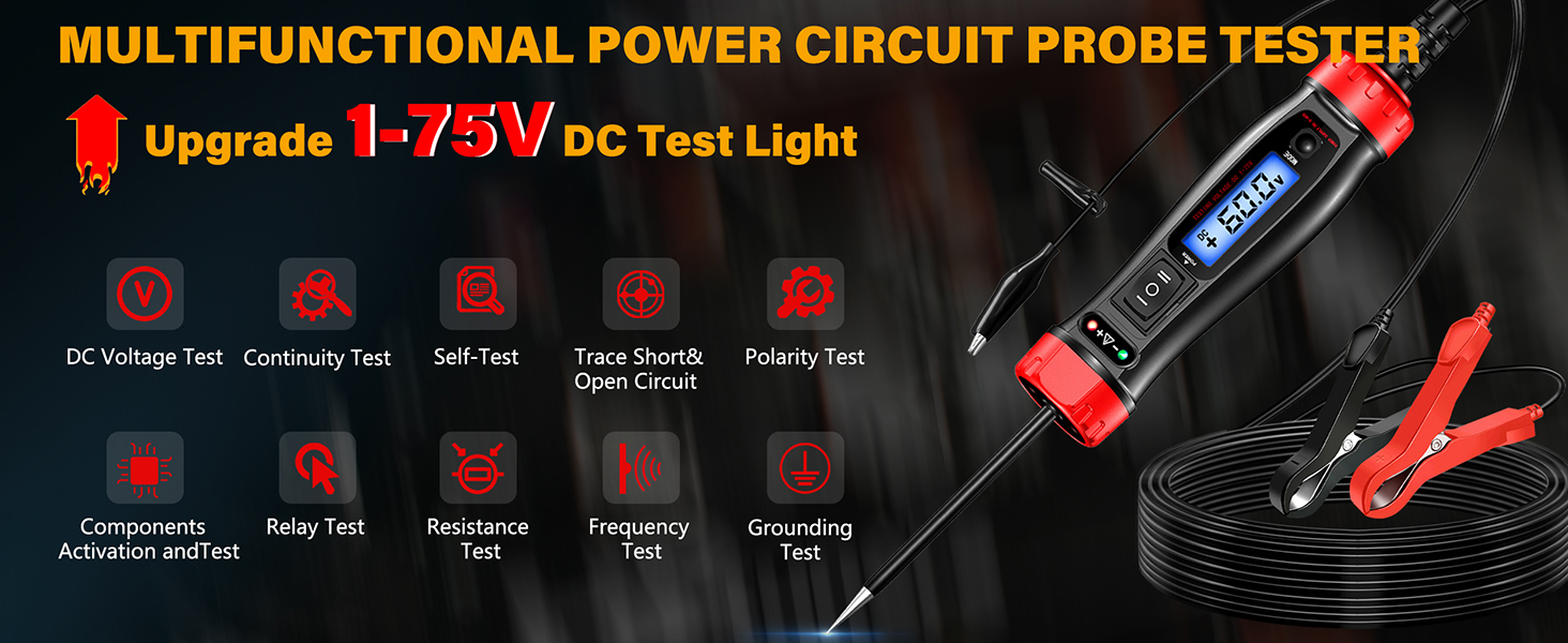 • اختبار مسبار الدائرة متعدد الوظائف: يحتوي هذا الاختبار الكهربائي على وظائف متعددة، مثل قطبية دائرة الكشف، والجهد، والمقاومة، والتردد، والاتصال، والكسر، والإضاءة، وقابس الإشعال، وقياس المستشعر، واختبار التأريض، وتنشيط المكونات وغيرها من الوظائف. يمكنه المساعدة بسرعة في تشخيص الأعطال في النظام الكهربائي للمركبة دون الحاجة إلى أدوات إضافية.