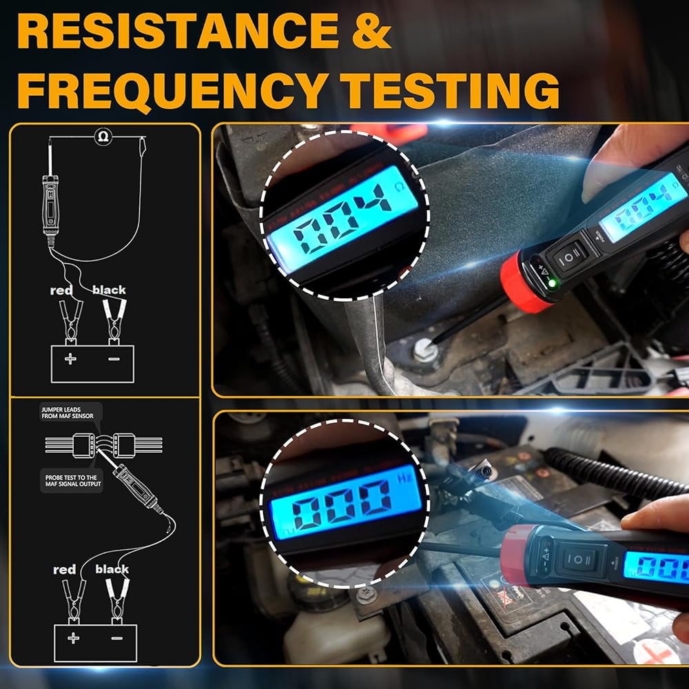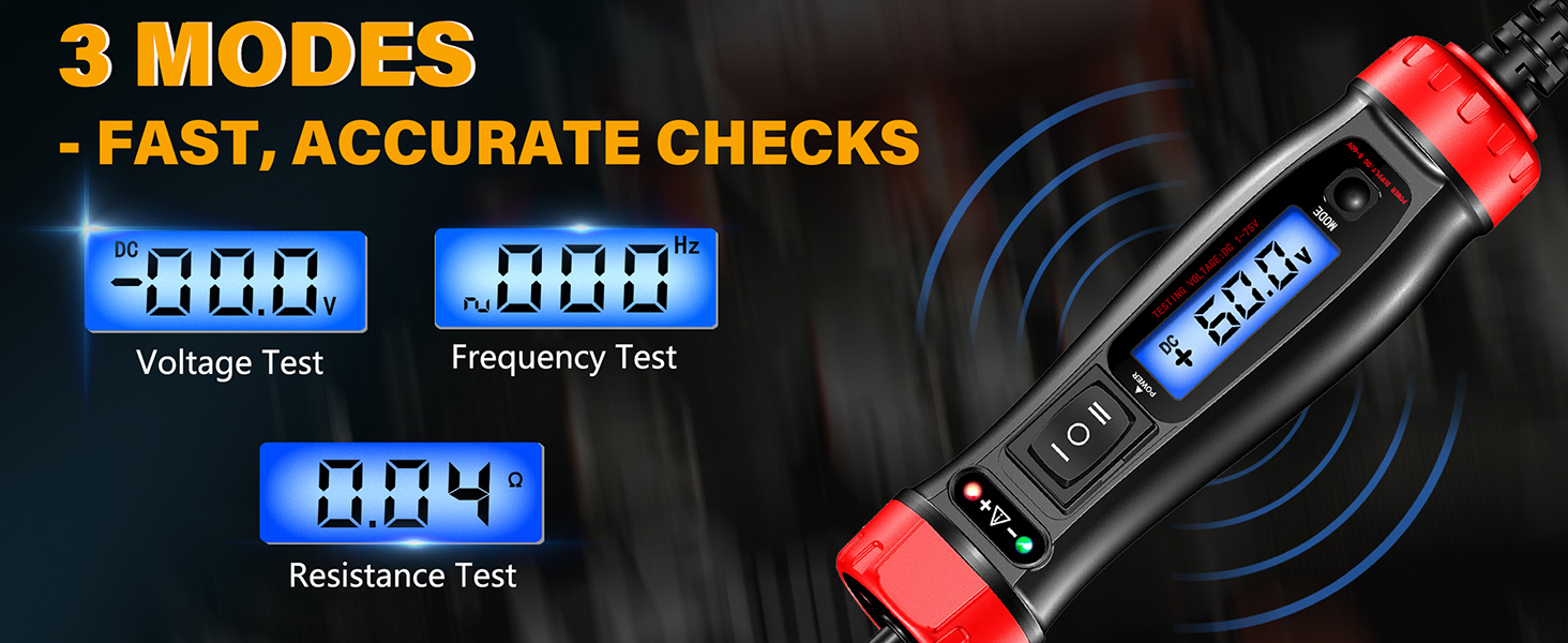 • أداة تشخيص الدائرة ذات 3 أوضاع: يدعم ضوء اختبار السيارات 3 أوضاع عمل: الجهد الكهربي، والمقاومة، ووضع التردد (الدقة: 0.1 فولت/0.1 أمبير)، مما يسمح لك بالتحقق بسرعة من الطاقة، وتتبع الإشارات، وقراءة الجهد الأدنى/الأقصى، وقياس التردد، أو التحقق من الأرض والاستمرارية بسهولة. يتم تشغيله بواسطة بطارية السيارة، ولا حاجة إلى بطارية إضافية.