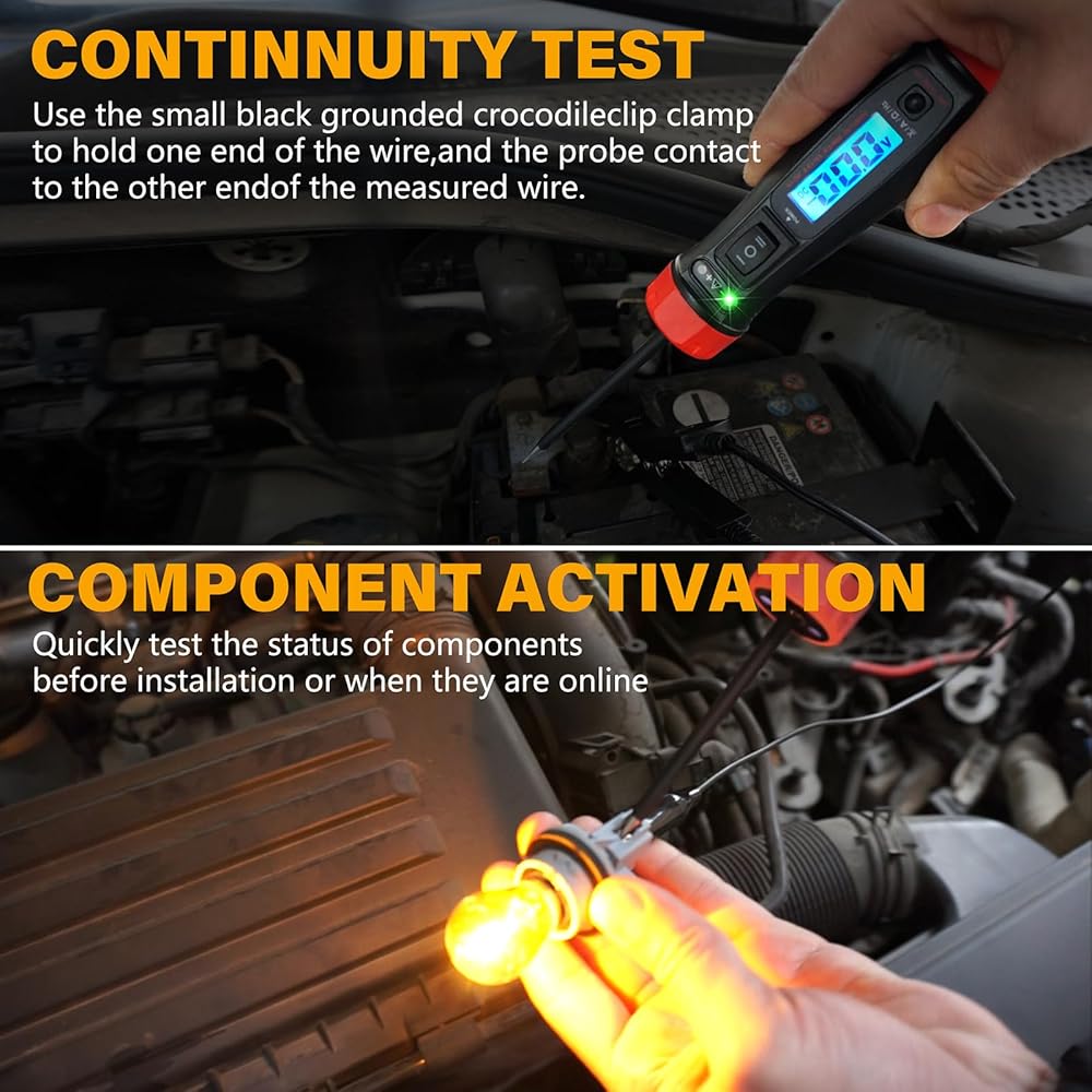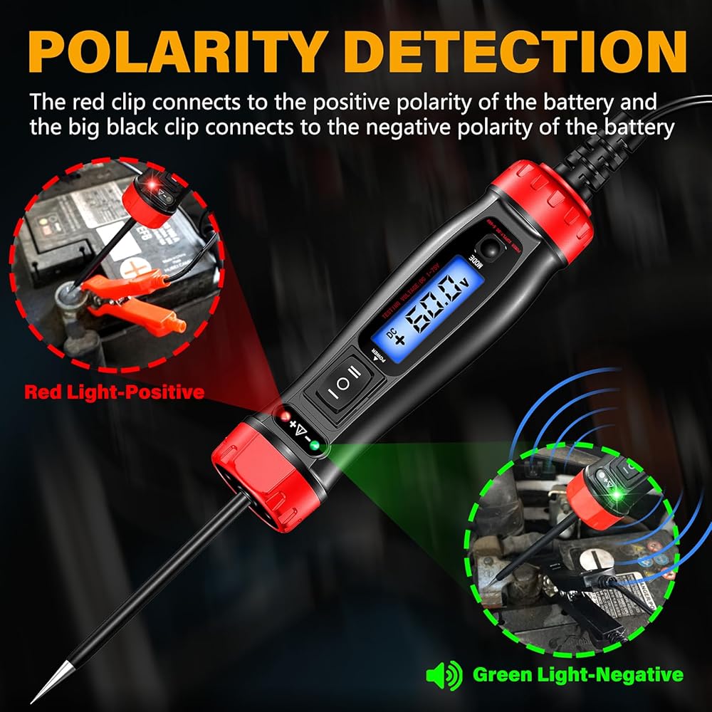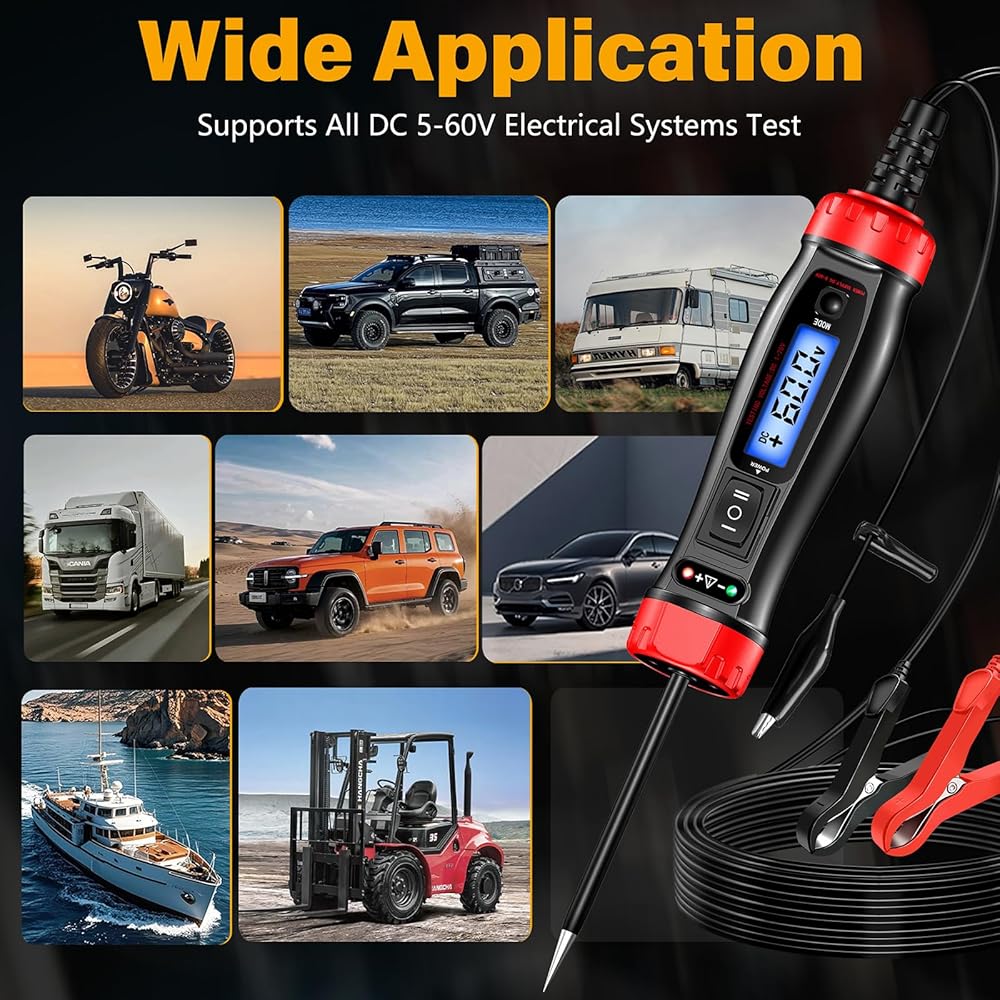 • موقع الدائرة القصيرة: جهاز اختبار مسبار دائرة الطاقة هذا مناسب للتشخيص في جميع الأنظمة الكهربائية للمركبات من 5 فولت إلى 60 فولت تيار مستمر. يمكنه فحص المفاتيح والمرحلات والصمامات والدوائر، مما قد يساعدك على تقليل وقت التشخيص في الأنظمة الكهربائية للسيارات.