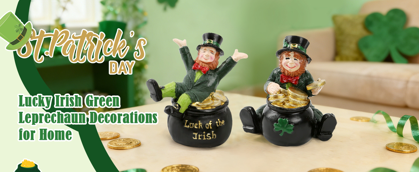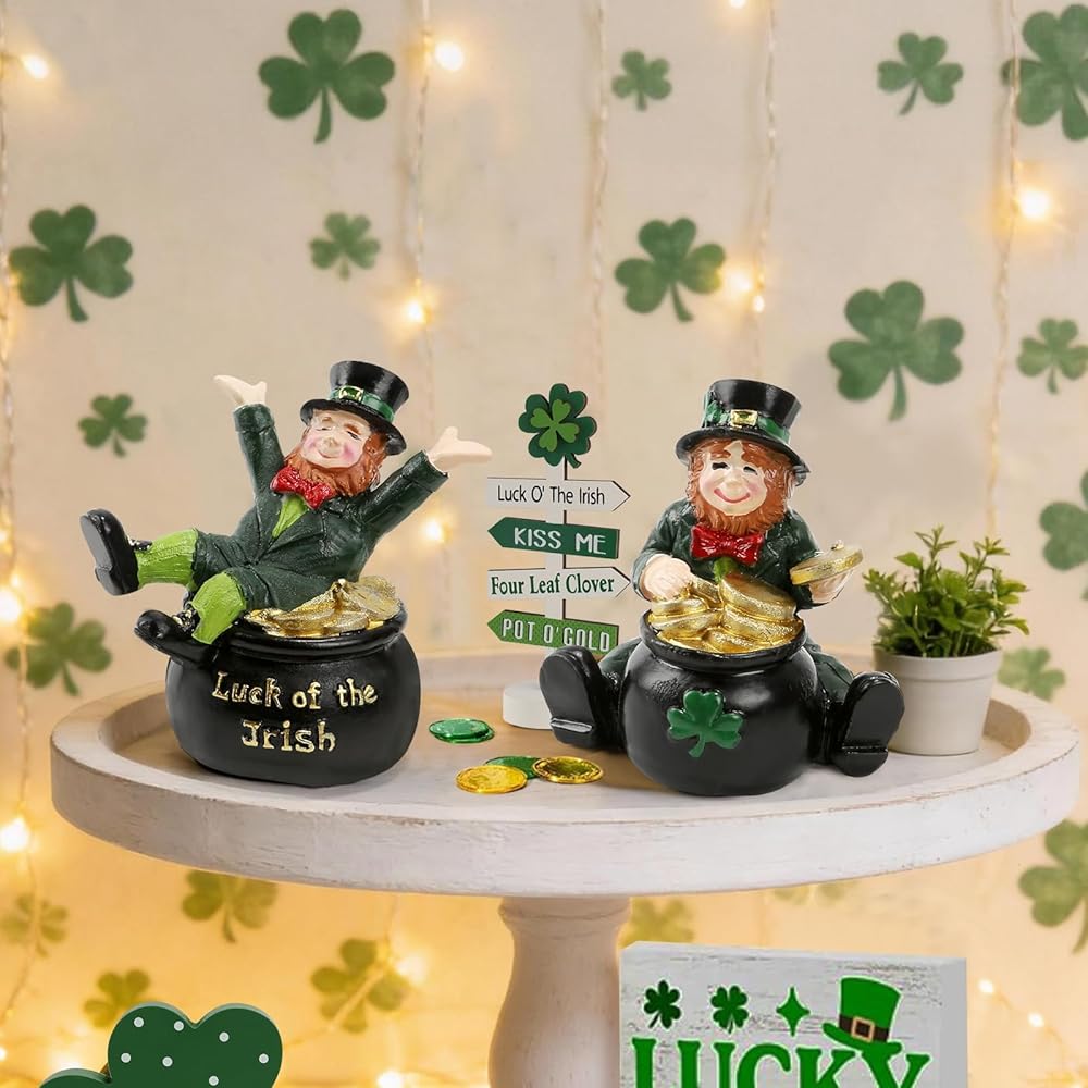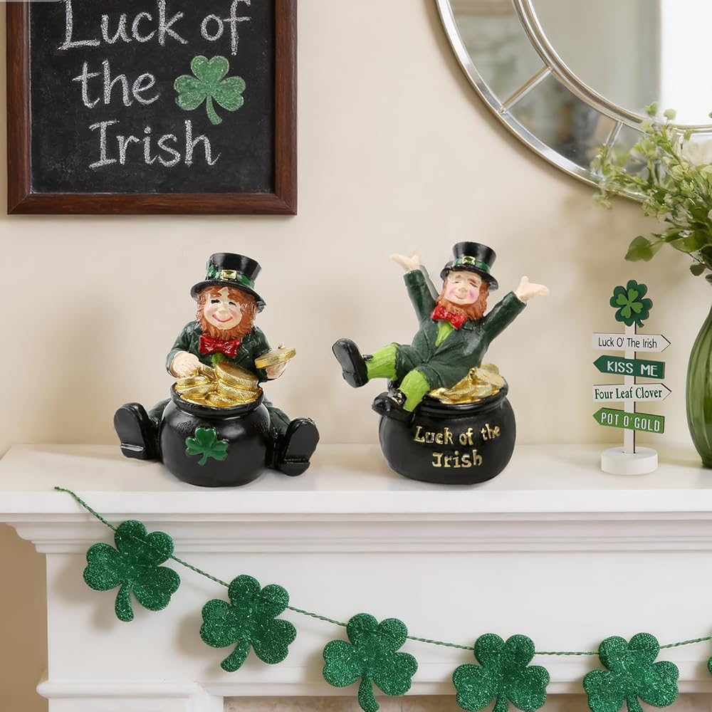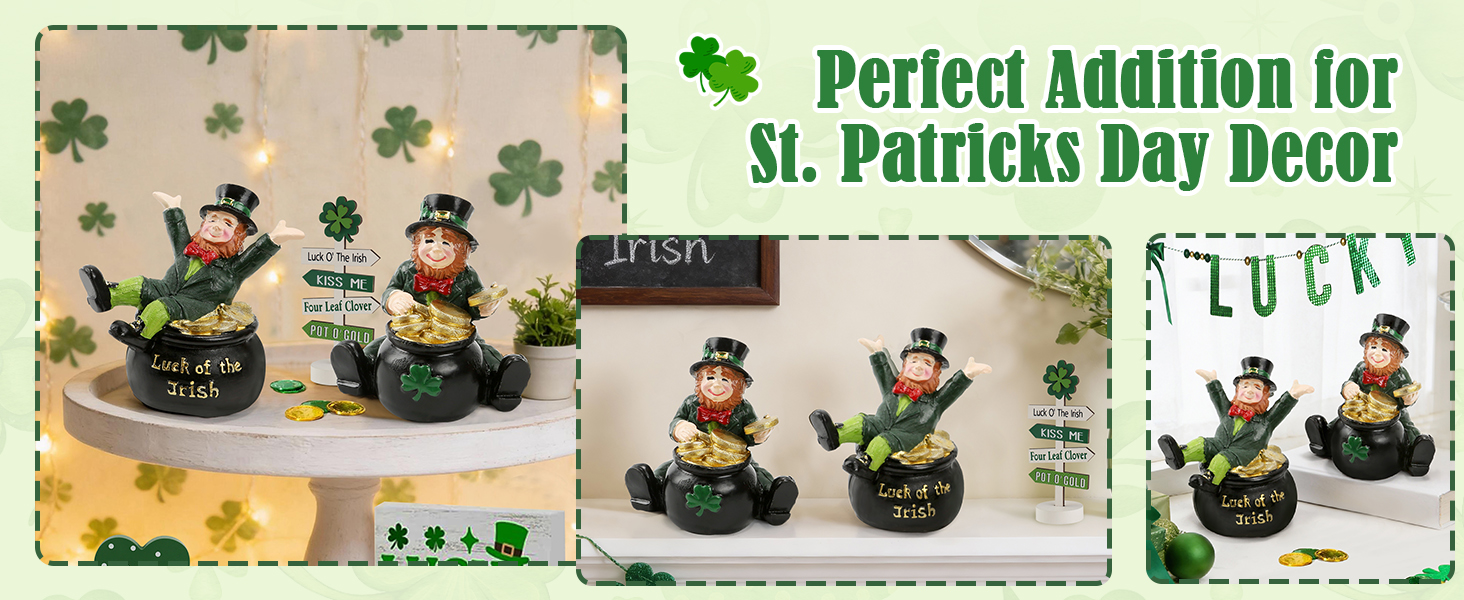 🎨 تصميم ذو طابع أيرلندي كلاسيكي - الملابس الخضراء التقليدية، وعاء أسود من الذهب، وعناصر "Luck of the Irish" تخلق لمسة موسمية ساحرة تتماشى جيدًا مع ديكورات القديس باتريك الأخرى.