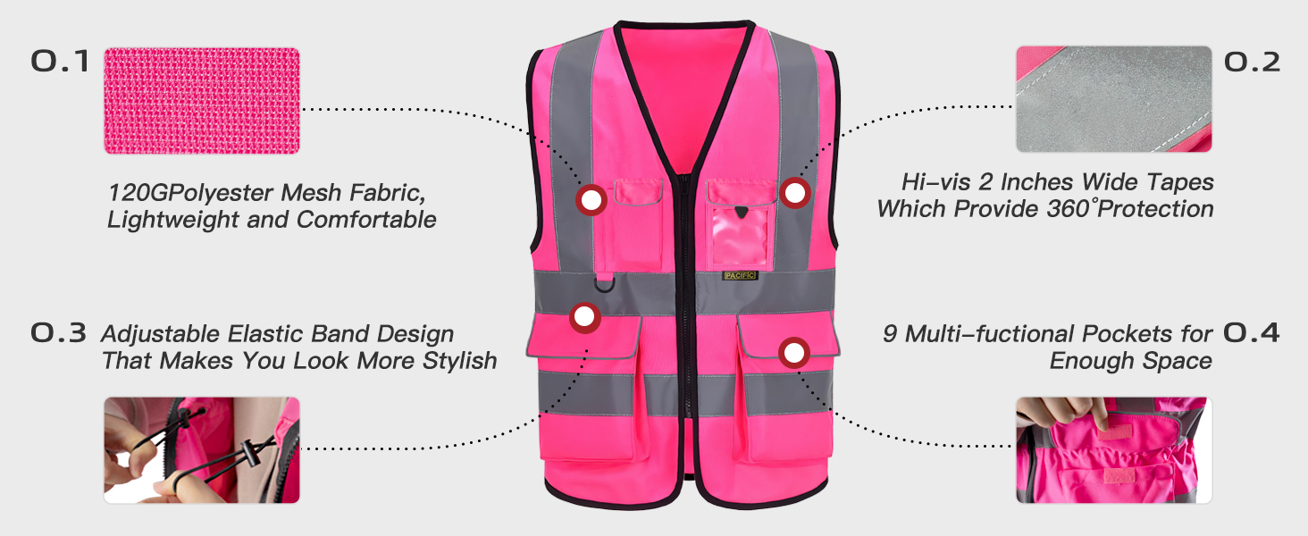• 𝗣𝗥𝗘𝗠𝗜𝗨𝗠 𝗠𝗔𝗧𝗘𝗥𝗜𝗔𝗟: سترة أمان وردية عاكسة مصنوعة من مادة البوليستر بنسبة 100٪. سترة الأمان Hi vis خفيفة الوزن ومريحة، ومسامية، وقابلة للطي، وسهلة الحمل.