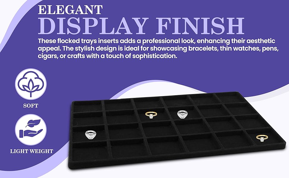 لمسة نهائية أنيقة للعرض: تضيف حشوات الصواني المتدفقة هذه مظهرًا احترافيًا، مما يعزز مظهرها الجمالي. يعد التصميم الأنيق مثاليًا لعرض الأساور أو الساعات الرفيعة أو الأقلام أو السيجار أو الحرف اليدوية بلمسة من الرقي.
