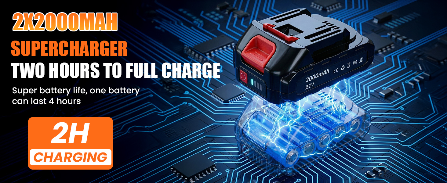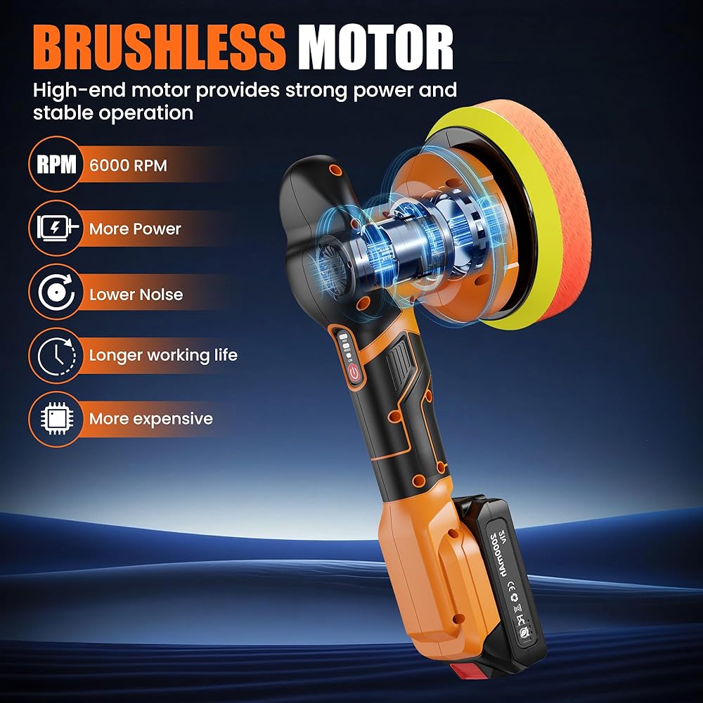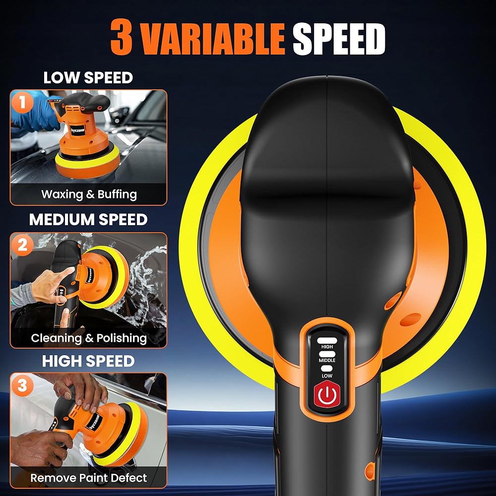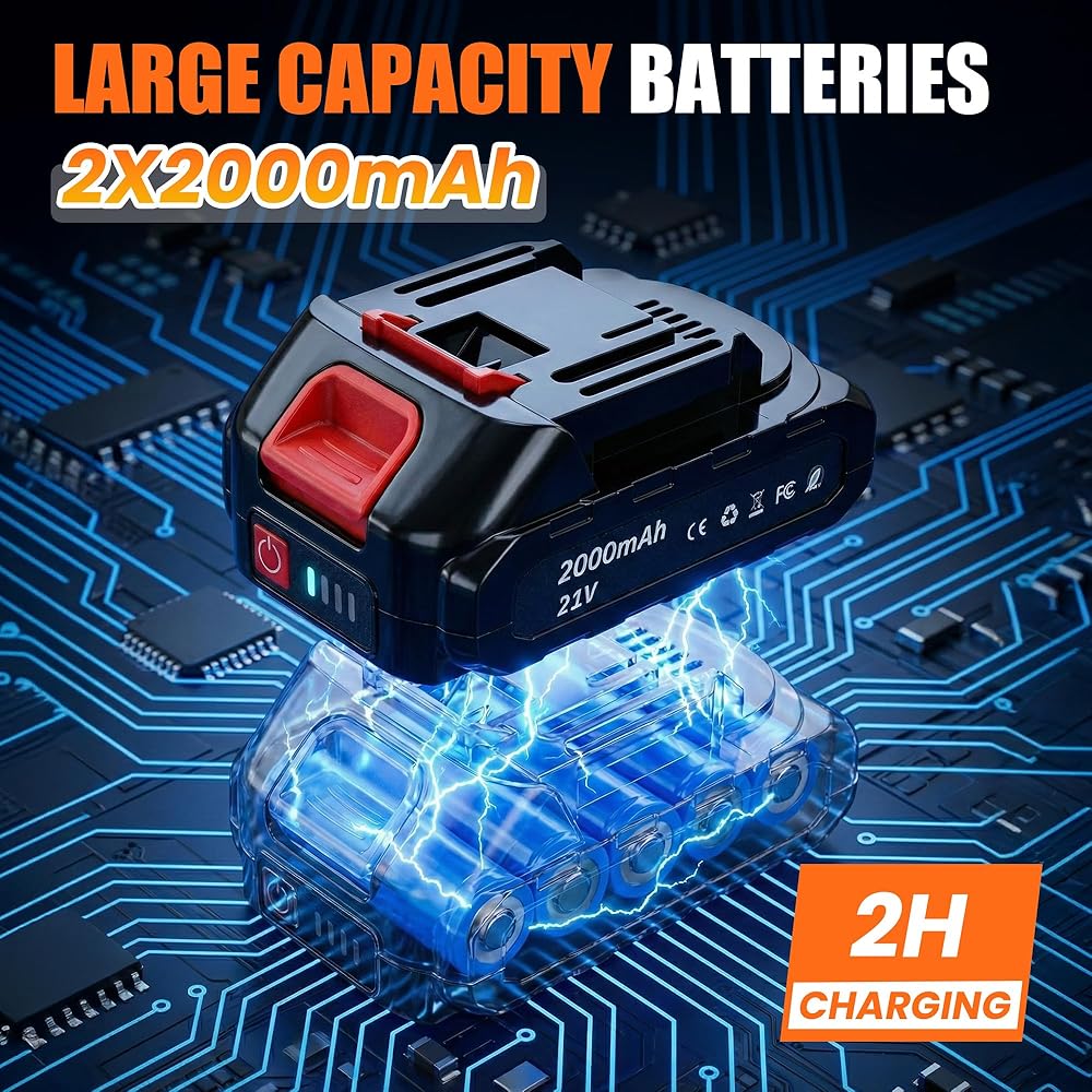 بطارية ذات سعة كبيرة وسرعة قابلة للتعديل - مجهزة ببطاريتين قابلتين لإعادة الشحن 21 فولت 2000 مللي أمبير في الساعة وشاحن سريع، وهي تدعم الاستخدام البديل للتخلص من قلق البطارية. يتميز بـ 3 مستويات سرعة قابلة للتعديل (2500-6000 دورة في الدقيقة) ومدار عشوائي 8 مم، ويوفر لمسة نهائية خالية من الدوامات ويتكيف مع احتياجات التلميع والتنظيف المتنوعة.