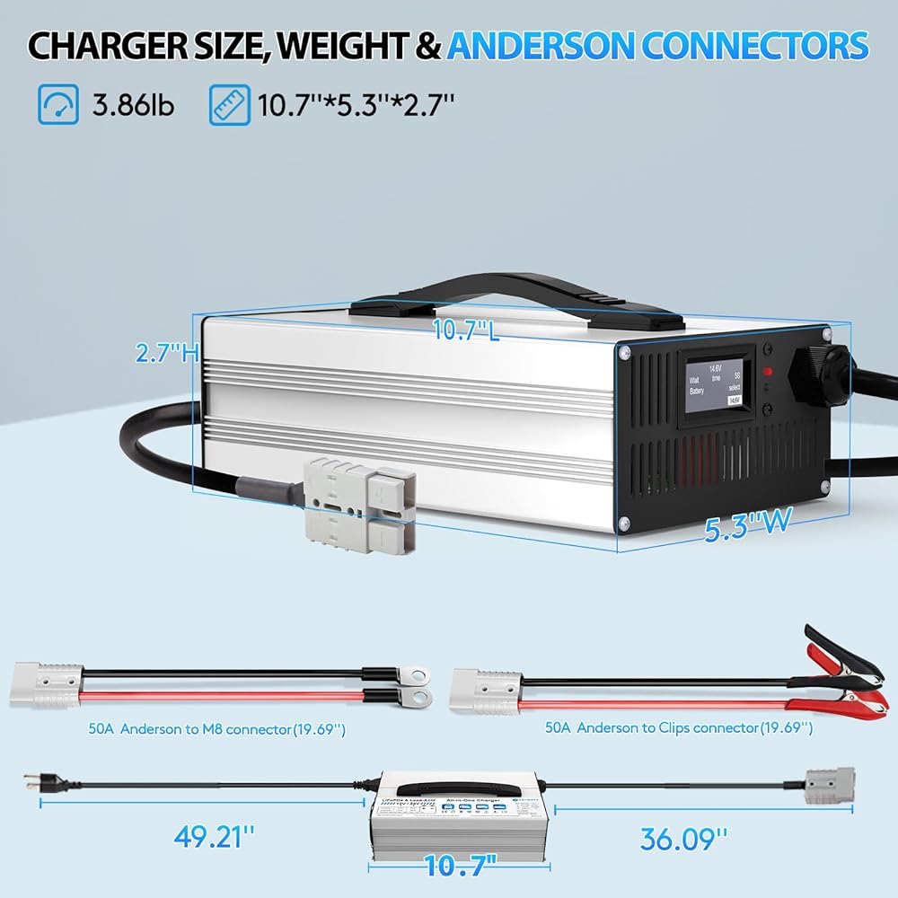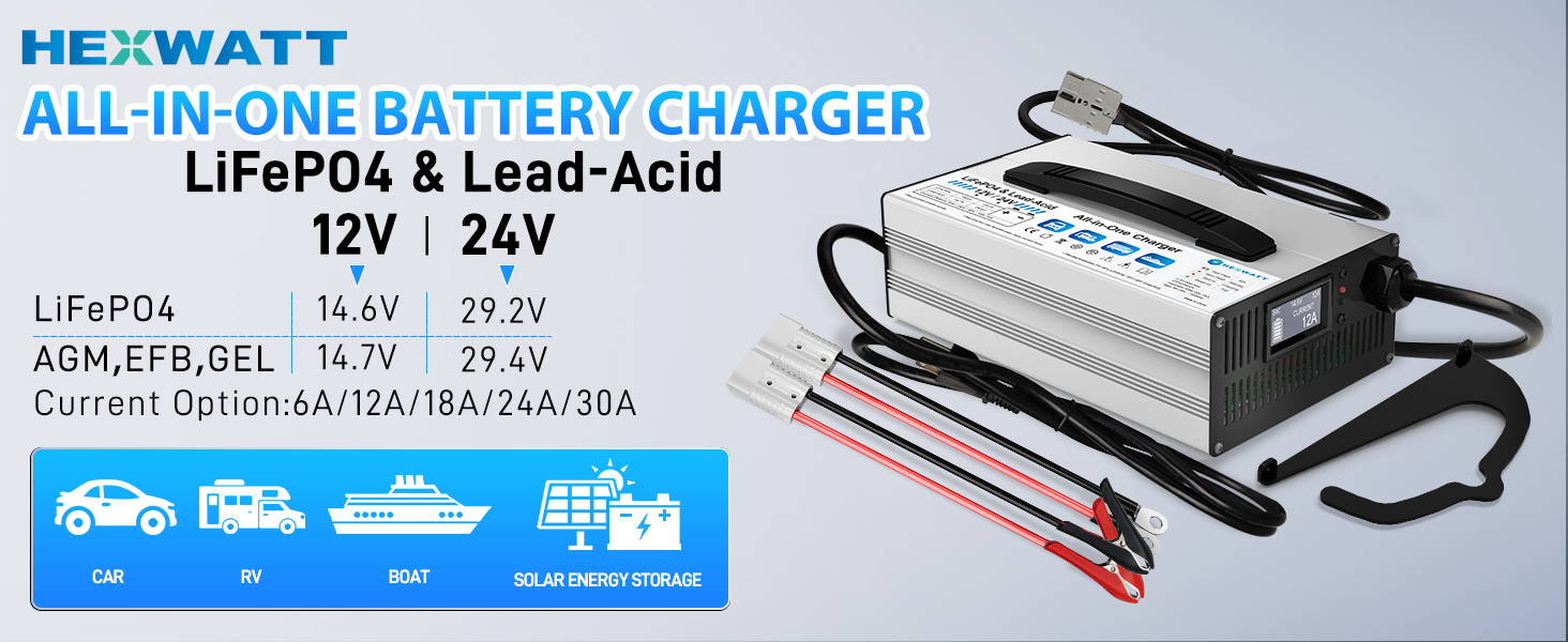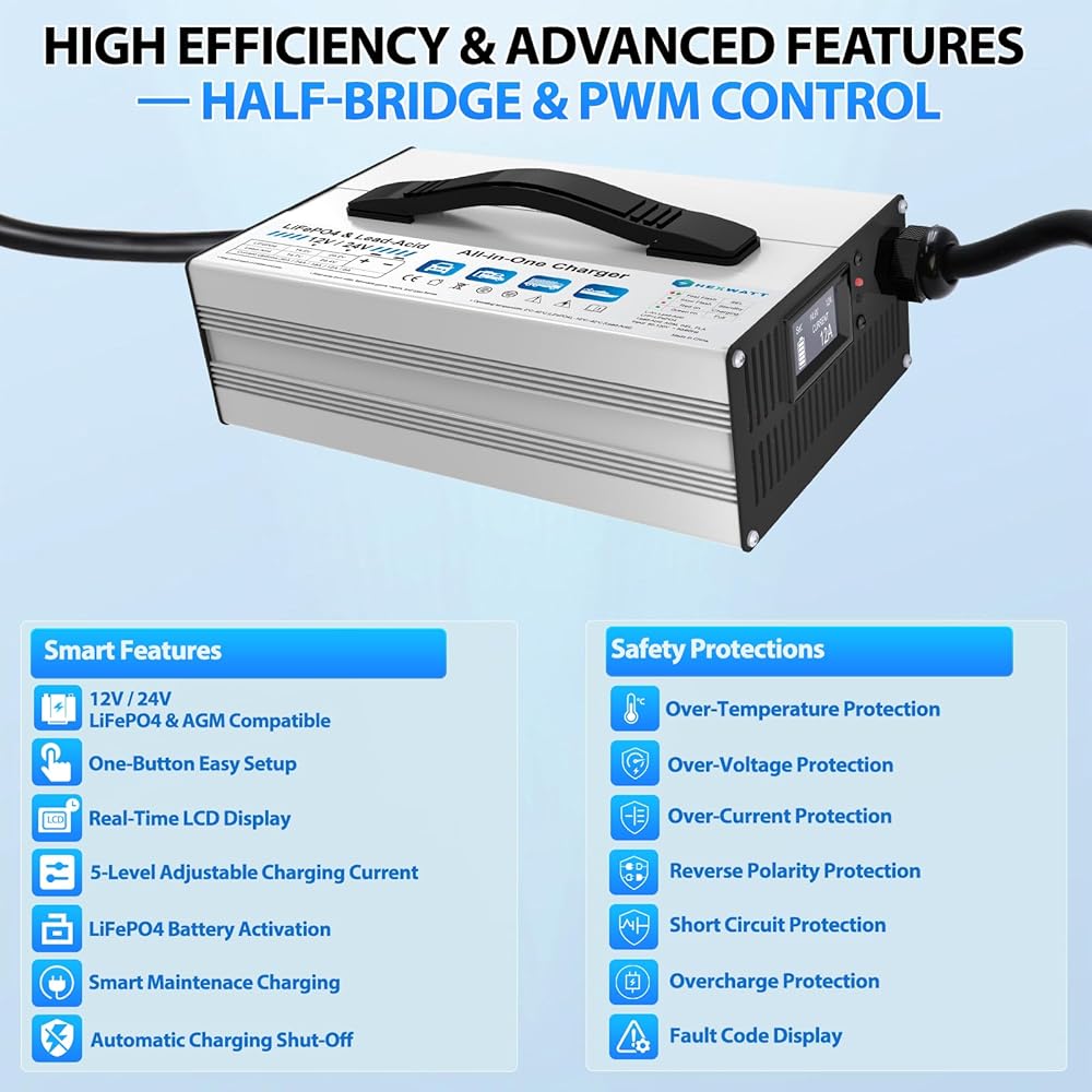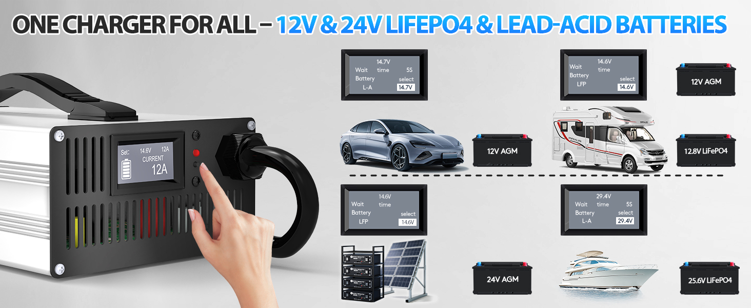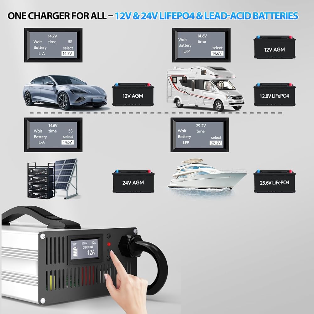 • ✅شاحن ذكي الكل في واحد - 12 فولت و24 فولت LiFePO4 وحمض الرصاص - متوافق مع كل من بطاريات LiFePO4 وحمض الرصاص (AGM، GEL، FLA)، هذا الشاحن الشامل يدعم أنظمة 12 فولت و24 فولت. مثالية للسيارات والمركبات الترفيهية والقوارب والمركبات الرباعية وجزازات العشب - لا حاجة لشواحن متعددة!