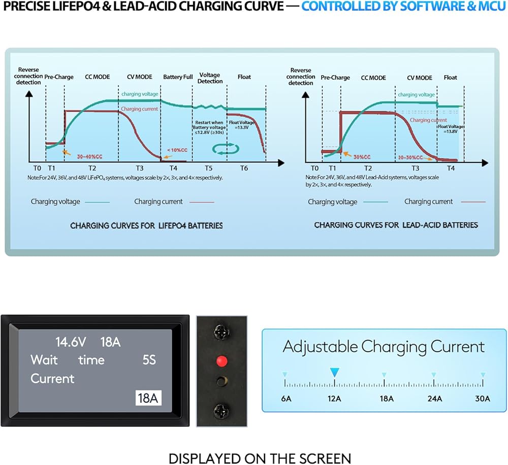 • ✅【شحن دقيق مع تيار وجهد قابلين للتعديل】شاحن متعدد الجهد (12 فولت/24 فولت)، يمكنك بسهولة ضبط جهد الإخراج وتيار الشحن (6A/12A/18A/24A/30A) ليناسب حجم البطارية وحالتها. قم بإطالة عمر البطارية وتحسين الأداء من خلال منحنيات الشحن متعددة المراحل التي يتم التحكم فيها بواسطة MCU.