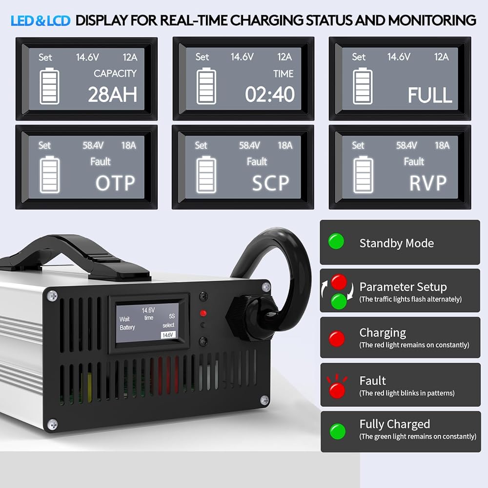 • ✅【حالة في الوقت الحقيقي على شاشة LCD وشاشة LED 】ابق متحكمًا مع شاشة LCD ساطعة تظهر جهد الشحن والتيار والسعة والوقت. تعرض مؤشرات LED حالة التشغيل وتحذيرات الأخطاء في لمحة.