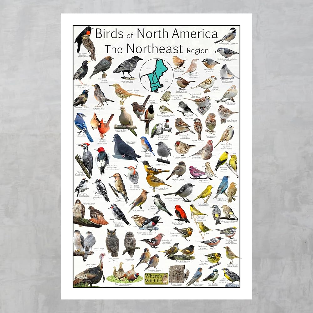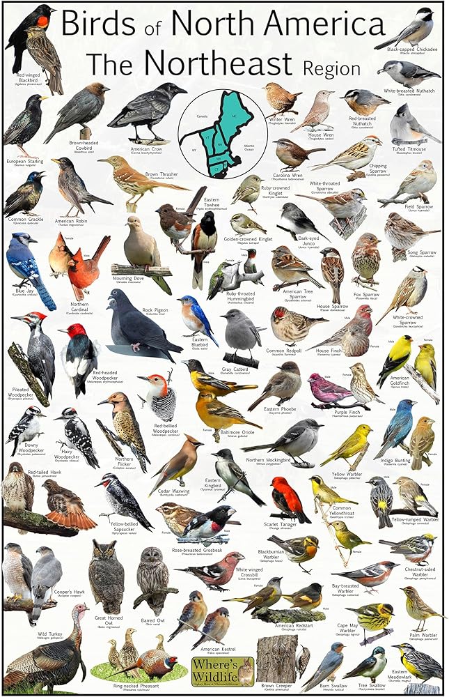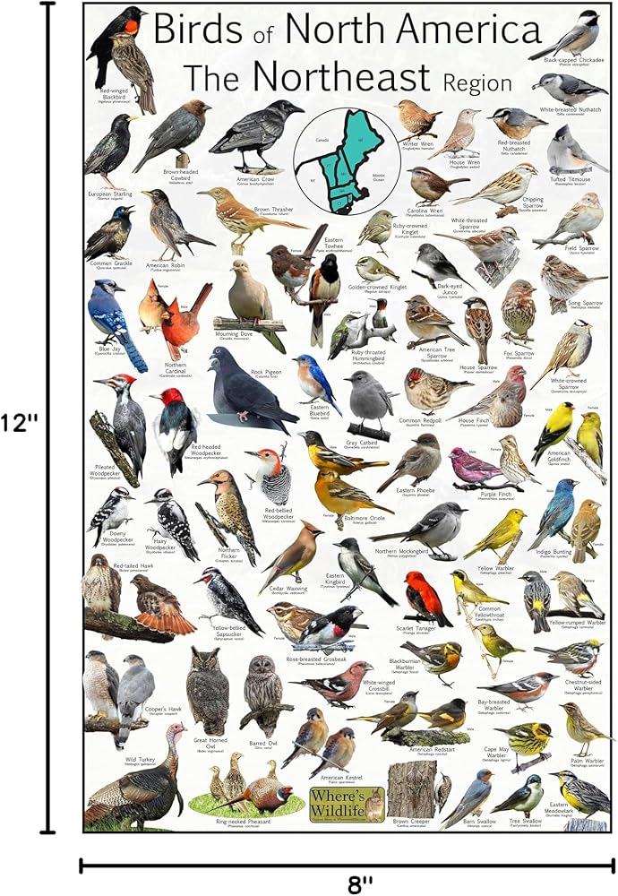 أين طيور الحياة البرية في أمريكا الشمالية المنطقة الشمالية الشرقية - توفر 73 تعريفًا للطيور - ملصق مراقبة الطيور في الفناء الخلفي - مخطط علوم الطبيعة (8 × 12 بوصة)