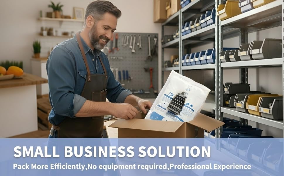 حل الأعمال الصغيرة: اتبع التعليمات المرفقة والفيديو التعليمي. تتوافق الرغوة المتوسعة مع شكل السلعة وحاوية الشحن، مما يمنع الحركة أثناء النقل. تظل الحقائب المغلفة بشكل فردي رفيعة حتى يتم تفعيلها، مما يتيح تخزينًا فعالاً للشركات المنزلية والمستودعات الصغيرة. بالنسبة للمواد الهشة، قم بإقرانها بحاويات ذات حجم مناسب واختبارها قبل الاستخدام التجاري. يوفر التخزين المدمج مساحة الرف مقارنة بلفائف التعبئة الضخمة. يمكنك التعبئة بشكل أكثر كفاءة مع الحماية المخصصة التي يتم تفعيلها عند الطلب