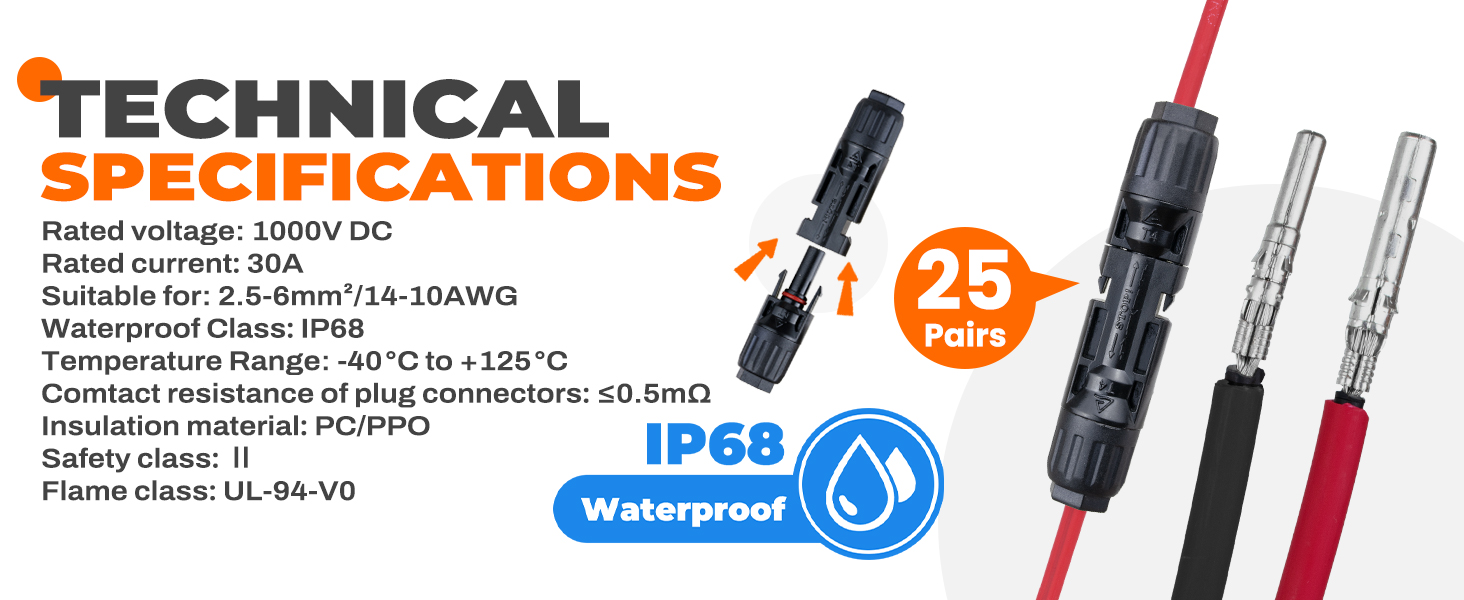 موصلات الطاقة الشمسية شديدة التحمل: يتميز كل موصل شمسي بغطاء معزول من مادة PPO مع وصلات نحاسية معلب للحصول على توصيل وقوة ممتازين. تم تصميمها لأداء مستقر ومقاوم للماء ومقاوم للطقس بدرجة IP68، كما أنها تحمي من التعرض للأشعة فوق البنفسجية والغبار والرطوبة - وهي مثالية لأي تركيب شمسي.
