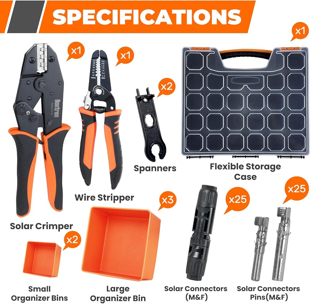 مجموعة الطاقة الشمسية الكاملة: تشتمل على أداة تجعيد الأسلاك الشمسية، ومزيل الأسلاك، و25 زوجًا من موصلات الألواح الشمسية، ومفتاحي ربط شمسيين - كل ما تحتاجه لتركيب موصلات كابلات الطاقة الشمسية السريعة والموثوقة. تأتي جميع الأدوات وملحقات الطاقة الشمسية في علبة متينة ومحمولة لسهولة التخزين والنقل.