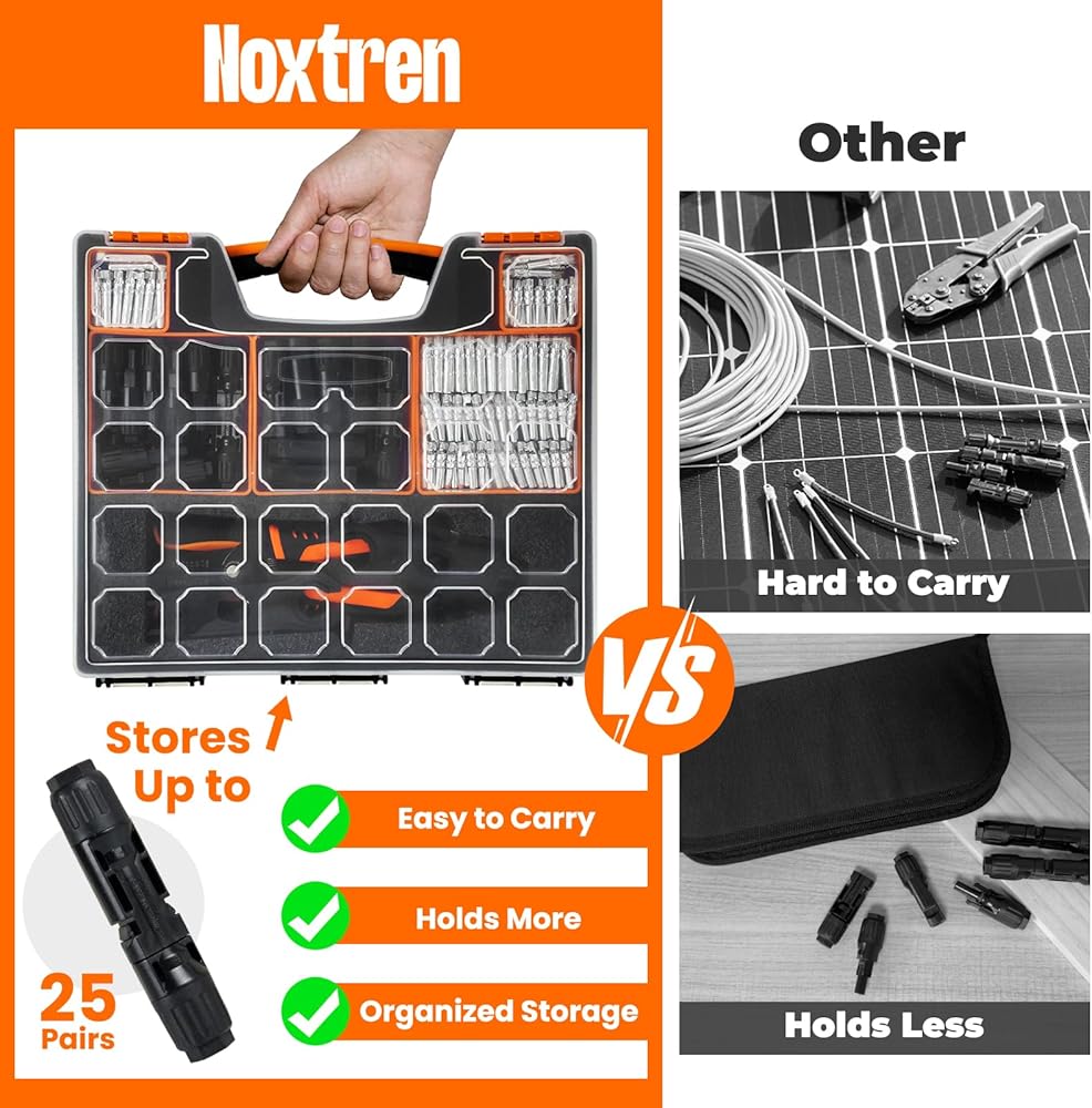 تصميم منظم ومحمول: تأتي مجموعة الموصلات الشمسية هذه في حقيبة حمل متينة ومحمولة مع صناديق تنظيم صغيرة قابلة للإزالة للفرز السريع والوصول. تظل كل أداة وموصل للطاقة الشمسية مرتبة بشكل أنيق وجاهزة للاستخدام - وهي مثالية للمحترفين ومستخدمي الأعمال اليدوية الذين يحتاجون إلى ملحقات طاقة شمسية فعالة أثناء التنقل.