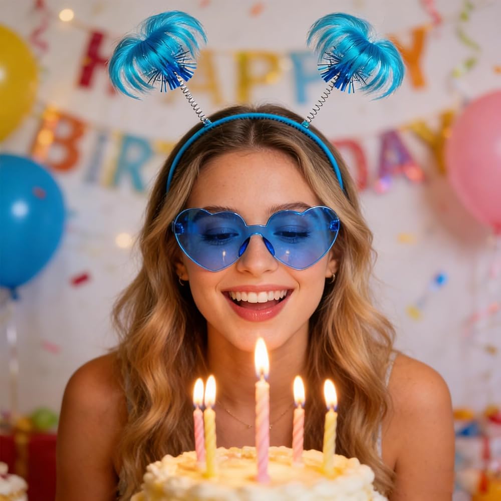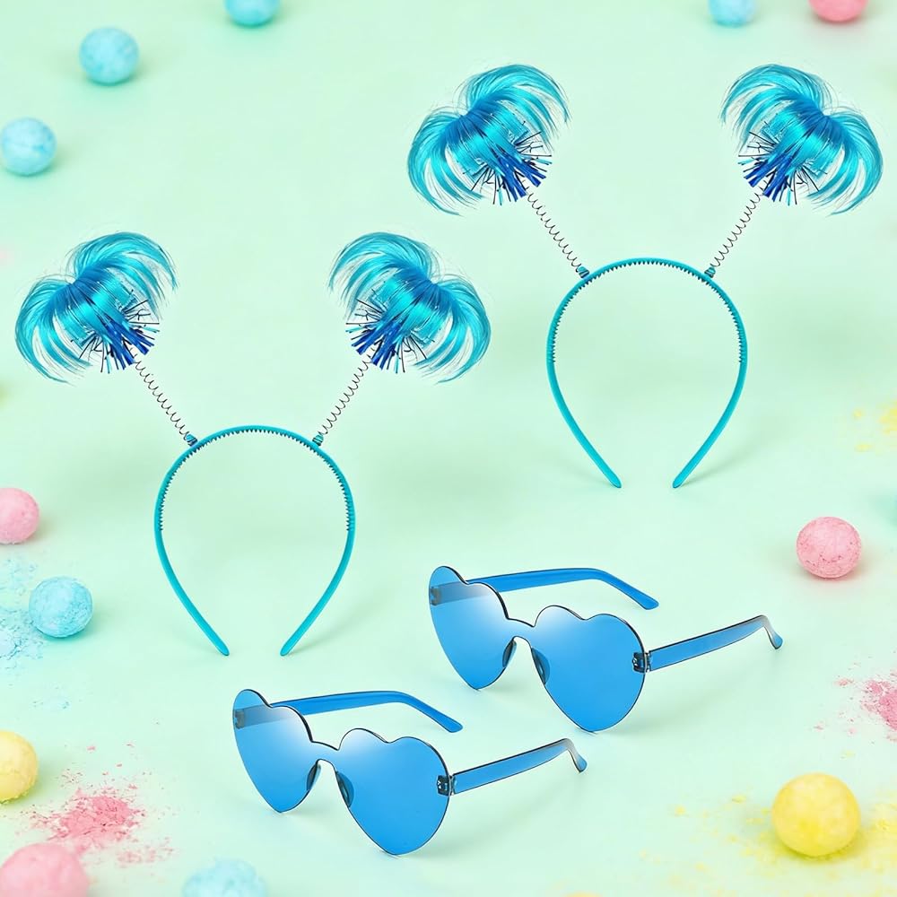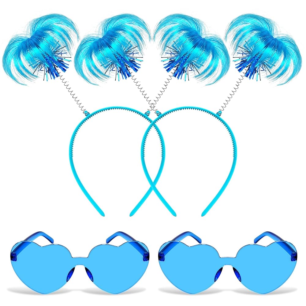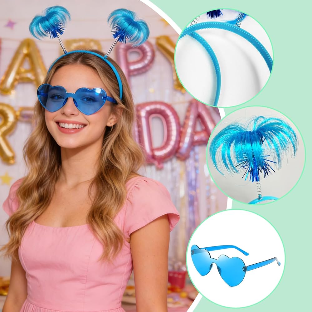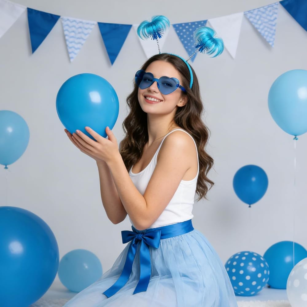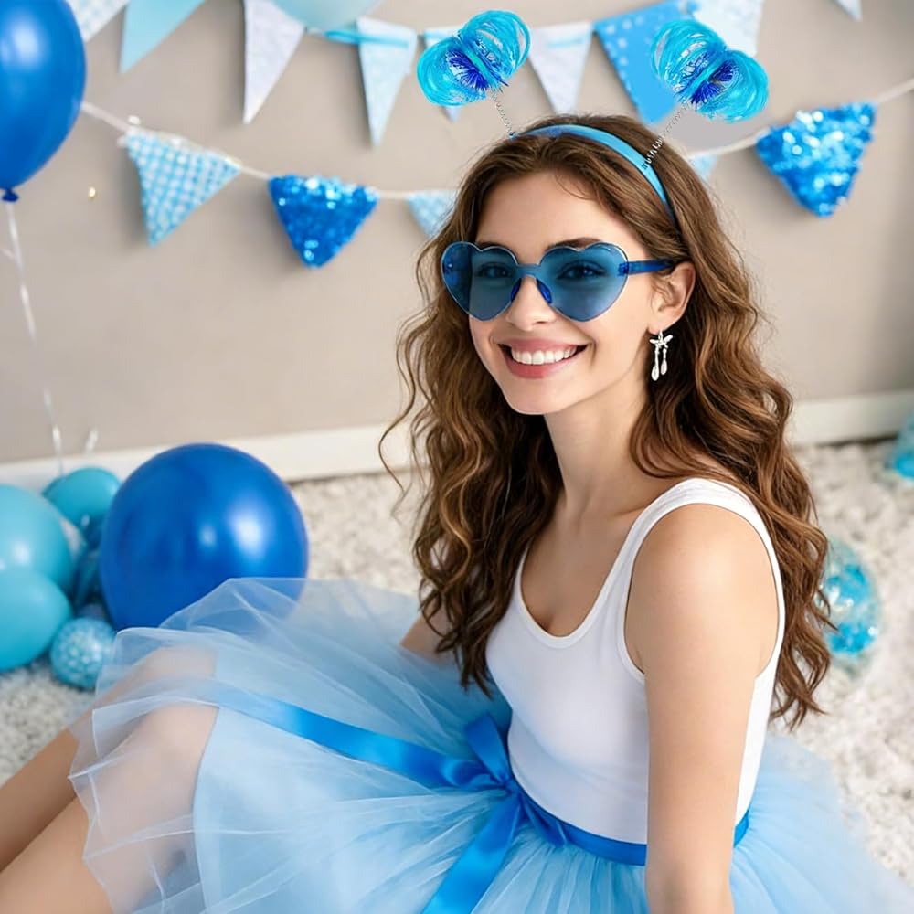 مجموعة إكسسوارات عصابات الرأس الزرقاء: سوف تحصل على عصابات رأس على شكل ذيل حصان وزوجين من النظارات الشمسية الزرقاء على شكل قلب بألوان زاهية ولافتة للنظر. تعمل هذه الملحقات على رفع مستوى أي زي على الفور، مما يجعلك مميزًا في المناسبات التنكرية والمناسبات الاحتفالية الأخرى.