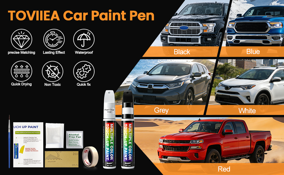 【نصائح تطبيق بسيطة】ابدأ بتنظيف وإزالة الشحوم من المنطقة المخدوشة. هز الطلاء لمدة 30 ثانية حتى يمتزج جيدًا. استخدم رأس القلم للرقائق الصغيرة والفرشاة المدمجة للضربات الأكبر. اختبره على ورق أبيض أولاً للتأكد من تطابق اللون والحصول على نتائج سلسة.