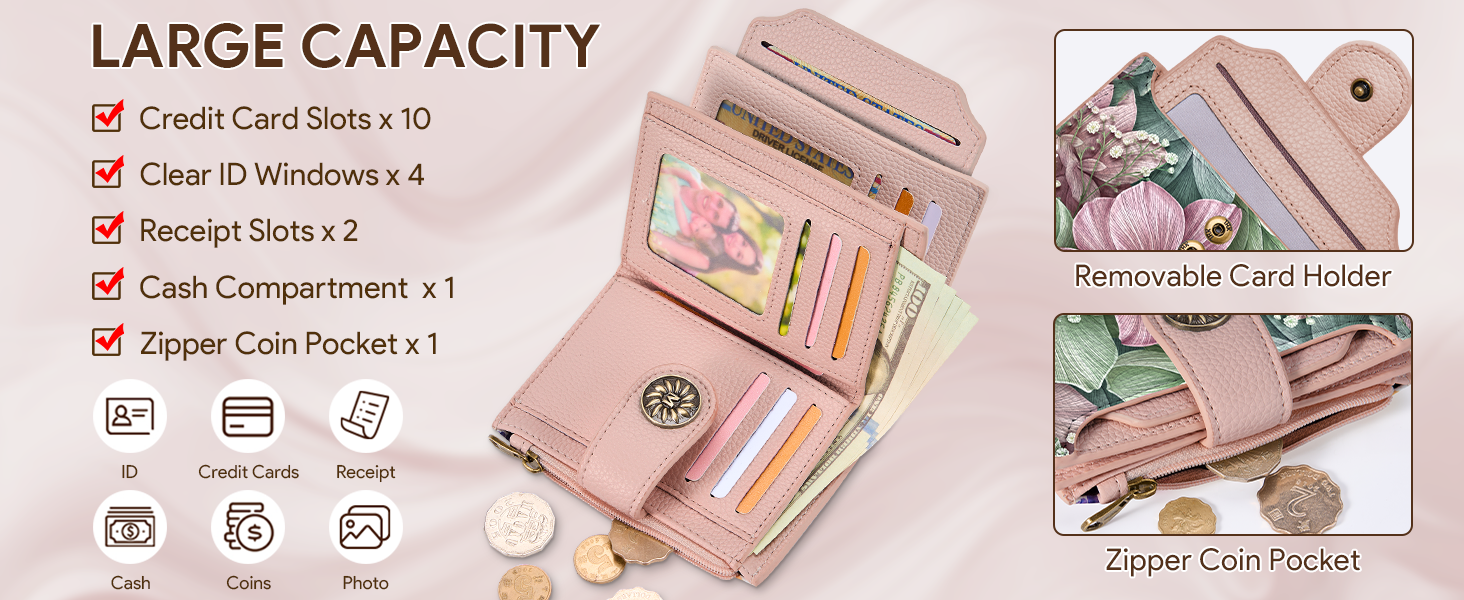 مساحة تخزين واسعة ومتعددة الاستخدامات: مصممة بـ 10 فتحات للبطاقات، وفتحتين للإيصالات، و4 نوافذ شفافة لبطاقة الهوية (بما في ذلك 2 قابلة للفصل)، وجيب واحد للعملات المعدنية بسحاب، ومساحة كاملة للفواتير، تحافظ هذه المحفظة المدمجة على بطاقات الهوية وبطاقات الائتمان والنقود والعملات المعدنية والإيصالات منظمة بشكل أنيق دون ضخامة.