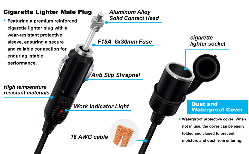 سلك تمديد ولاعة السجائر 15 أمبير مثل مضخة الإطارات وضاغط الهواء وعاكس الطاقة والمبرد والثلاجة وغيرها من الملحقات 12 فولت، يستخدم على نطاق واسع في السيارة والمركبات الترفيهية والشاحنات والقوارب