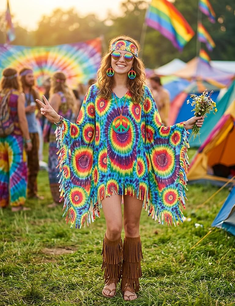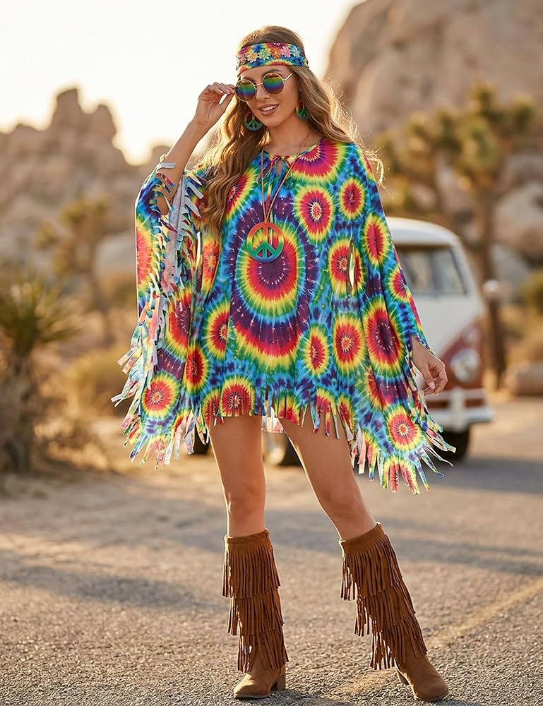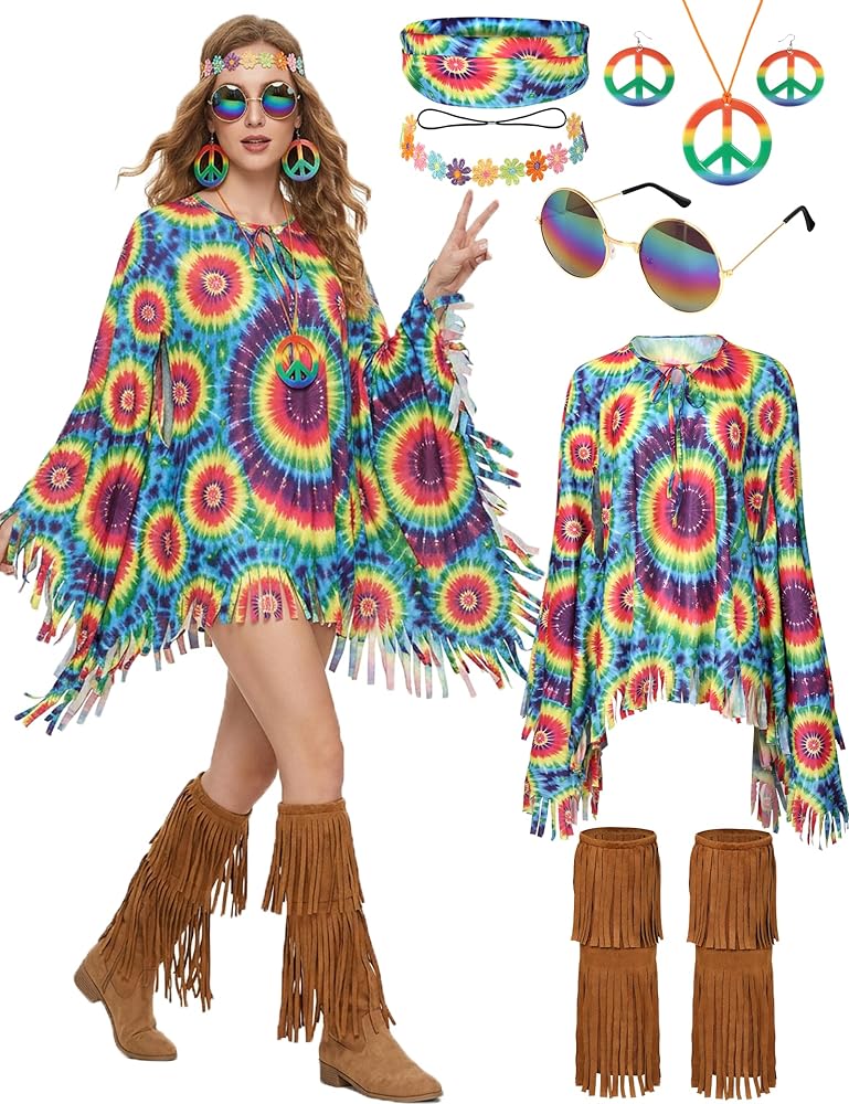 Elevate Your 70s Hippie & Disco Look With This All-in-One Costume Accessories Set! Includes Tie Dye Poncho, Flower Crowns, Headbands, Retro Sunglasses, Peace Sign Necklace, Earrings And Boot Covers—Iconic Retro Elements In One Pack. One Size Fits Most, Soft Comfy Materials For All-Day Wear. Perfect For Halloween, Disco Parties, Retro-Themed Events, Decades Day And Cosplay, Effortlessly Create Authentic 60s/70s Nostalgic Vibes!