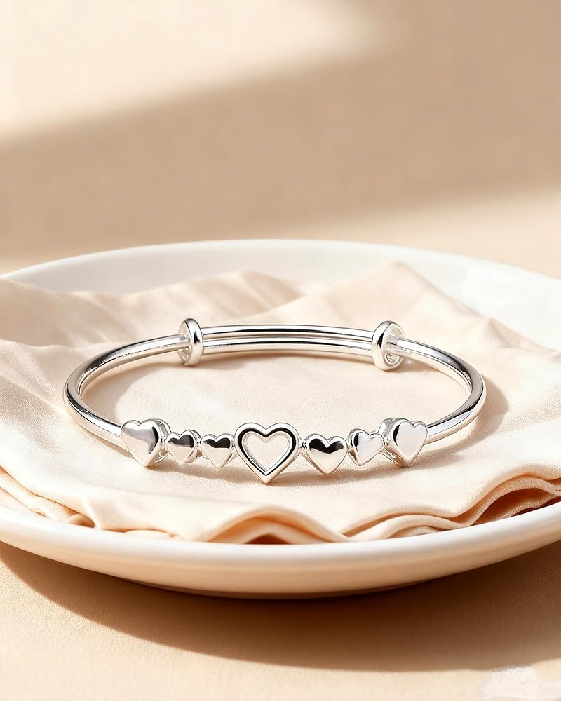 التصميم والمواد: تتميز أساور القلب المطلية بالفضة للسيدات بلمسات قلب مجوفة رقيقة، مما يخلق مظهرًا شبابيًا ورومانسيًا. يضيف اللون الفضي اللامع لمسة عصرية ومنعشة، وهو مثالي للفتيات المراهقات والشابات اللاتي يعشقن المجوهرات البسيطة والمرحة