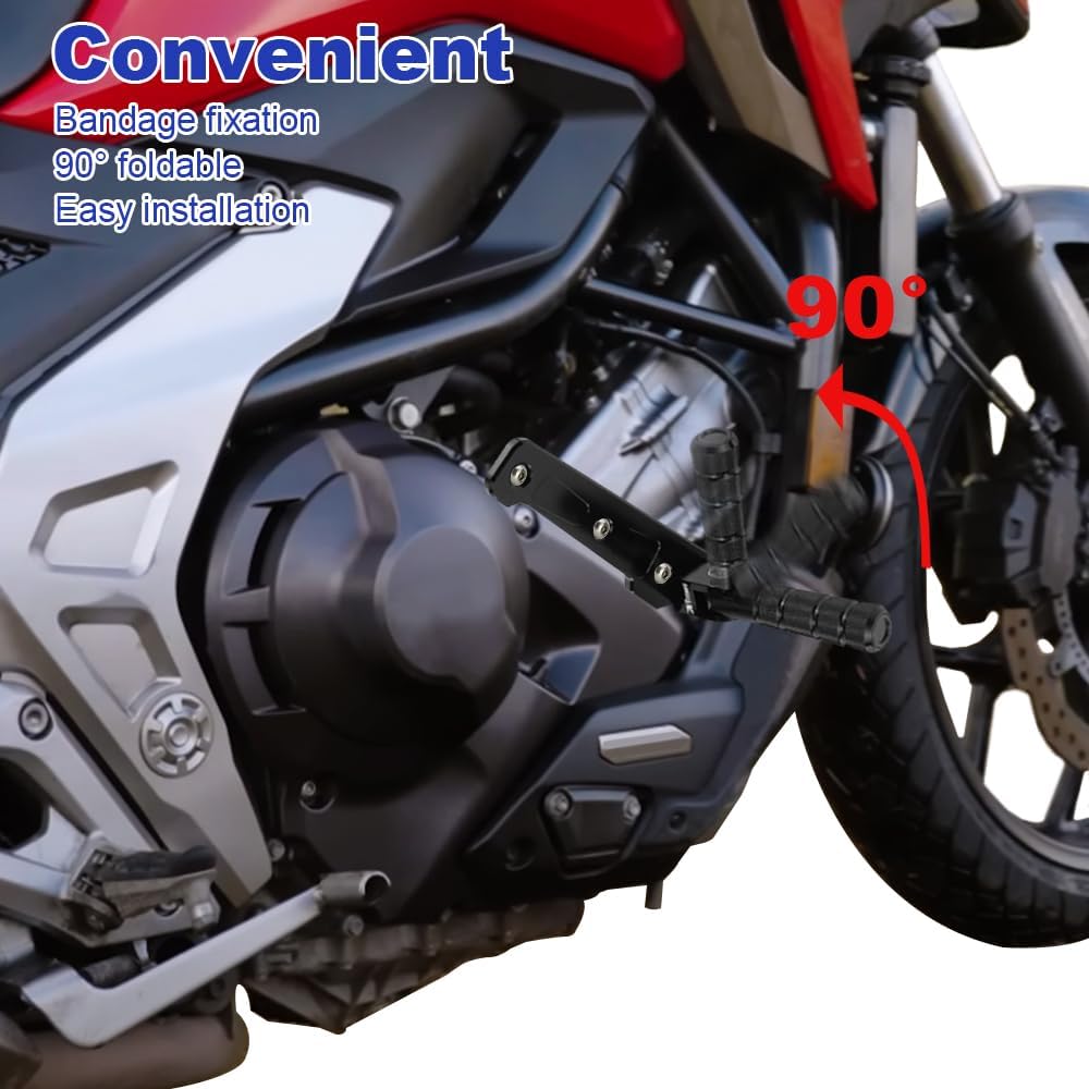 • RIDE LONGER: This product is designed to significantly enhance long-distance riding comfort by optimizing the rider's leg posture. It allows your feet to extend forward, finding a more natural and relaxed placement angle. This alleviates pressure and tension in weight-bearing joints and surrounding muscle groups caused by prolonged static positions. When you don't need to use the kickstand, you can easily fold it upward and stow it flush against the side of the vehicle