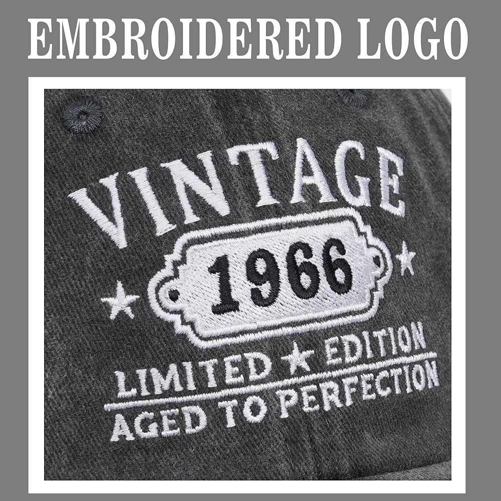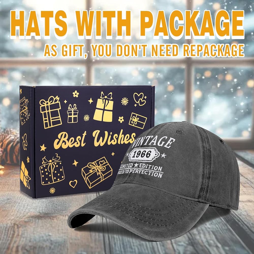 • Gift Box Packaging: This 1966 60th hat is carefully packaged in an exquisite gift box, which is sure to leave a deep and wonderful impression on the relatives and friends who receive the gift. When the men or women who receive the gift look at this beautiful gift box and slowly open it, they will see a hat engraved with their age and birth year.