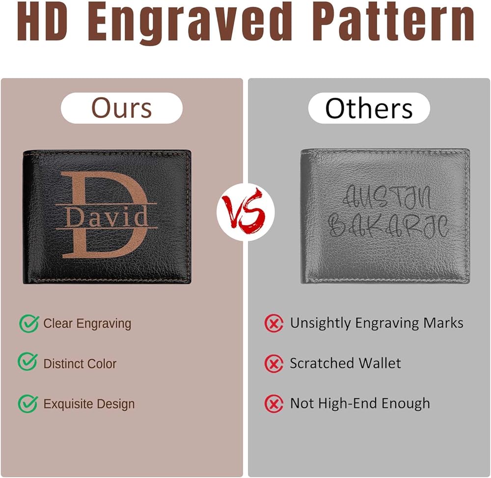 【منقوشة بالليزر ثلاثية الأبعاد دقيقة】ارفع مستوى حملك اليومي مع محفظة جلدية مخصصة للرجال، تتميز بنقش ليزر ثلاثي الأبعاد فائق الدقة (دقة 0.02 مم) للحصول على لمسة نهائية دائمة خالية من العيوب. يمكن تخصيص الجزء الأمامي أو الداخلي الأيسر أو الداخلي الأيمن للمحفظة بالأسماء أو الأحرف الأولى أو الكلمات الملهمة. اختر من بين 12 نمطًا متطورًا يناسب ذوقك، سواء كان كلاسيكيًا أو عصريًا. النقش العميق والدقيق لن يبهت، مما يضمن أن تصميمك الفريد يدوم مدى الحياة.