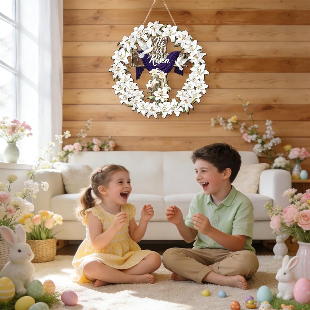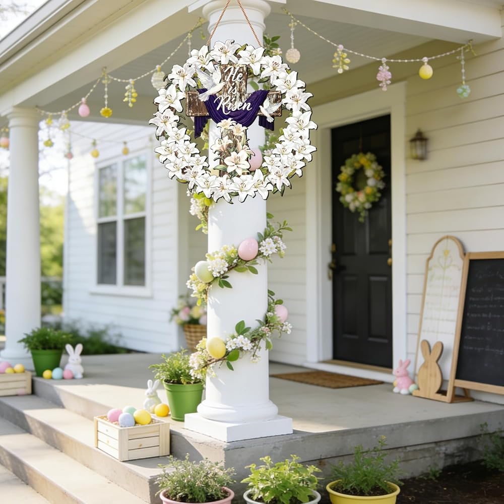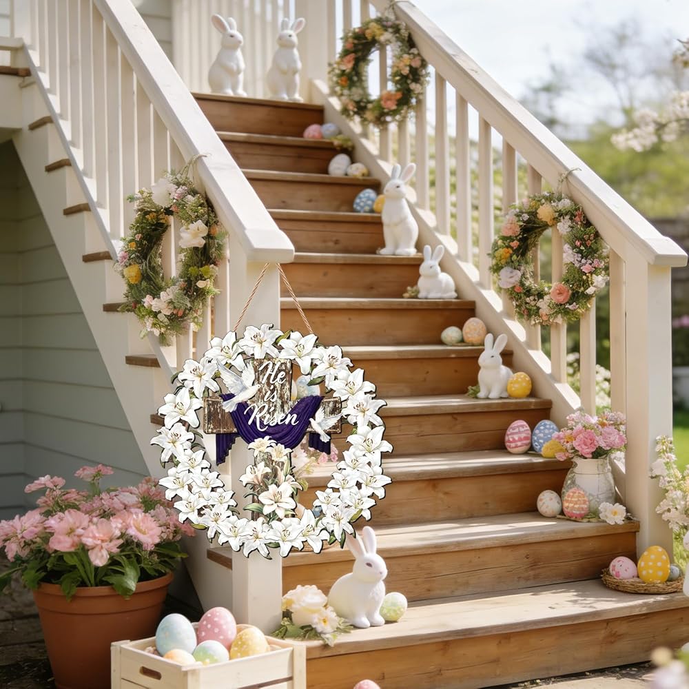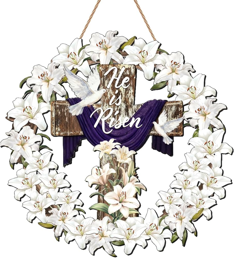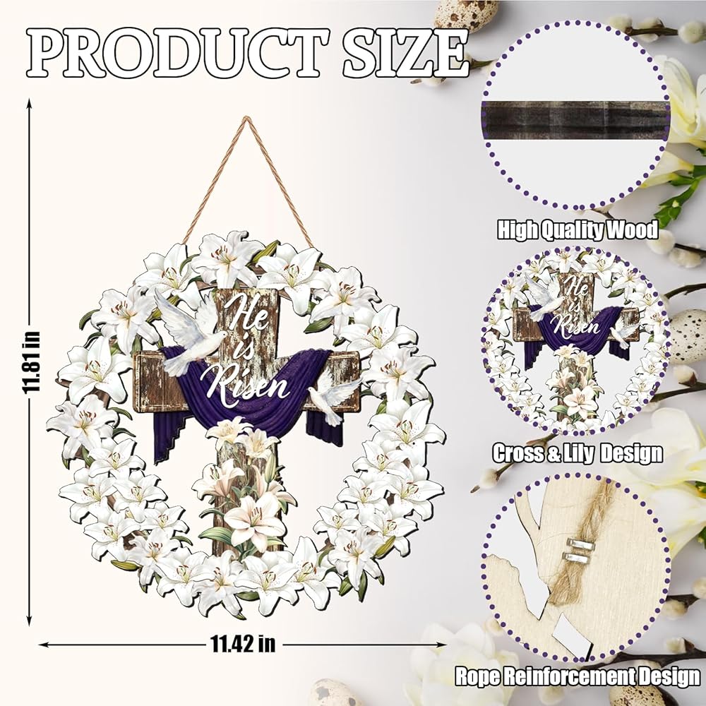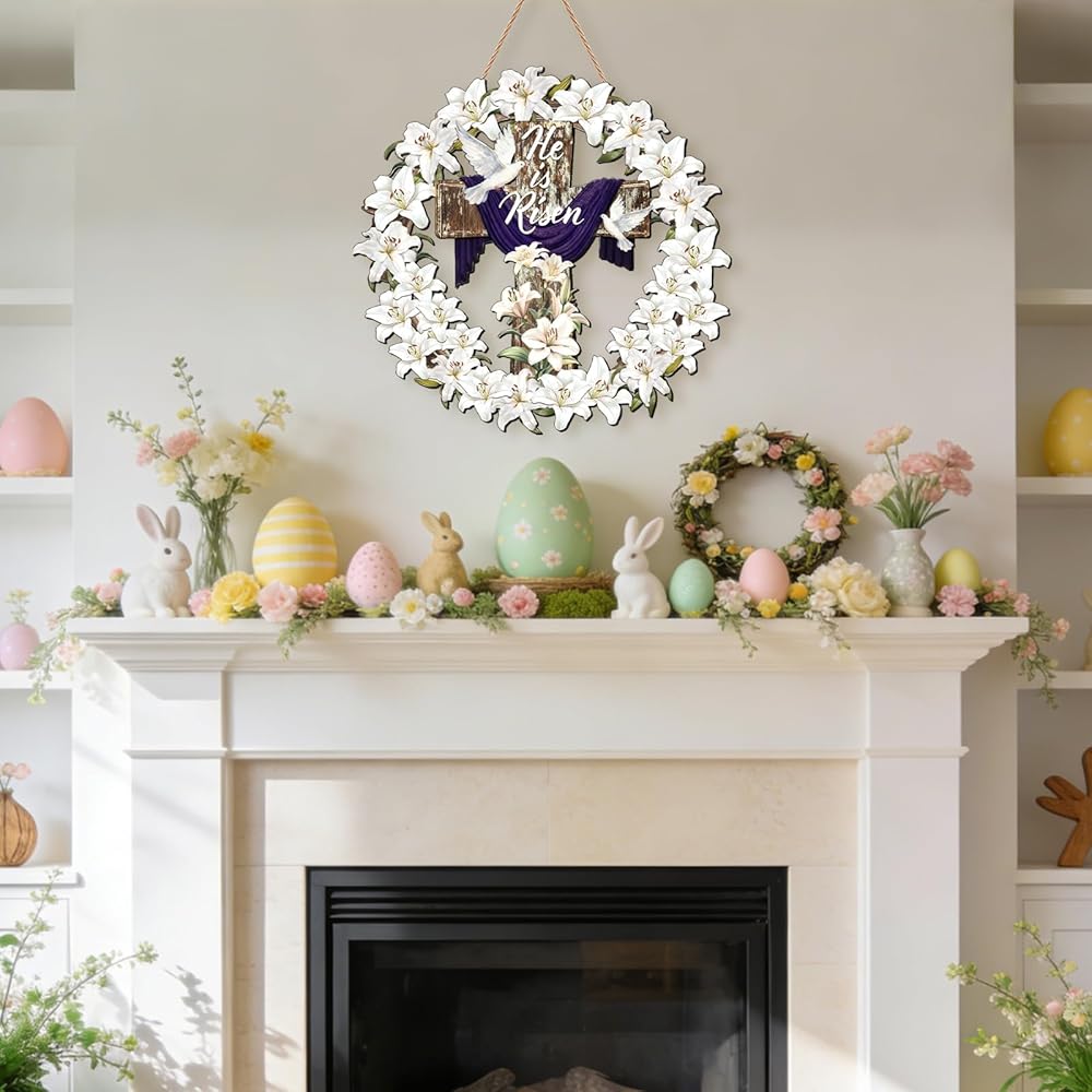 تصميم عيد الفصح: يتميز إكليل الباب المرتفع هذا بصليب إكليل عيد الفصح الخشبي مع زنابق حول صليب محفور "He Is Risen"، وهو مثالي لديكور عيد الفصح المسيحي وديكورات الأسبوع المقدس