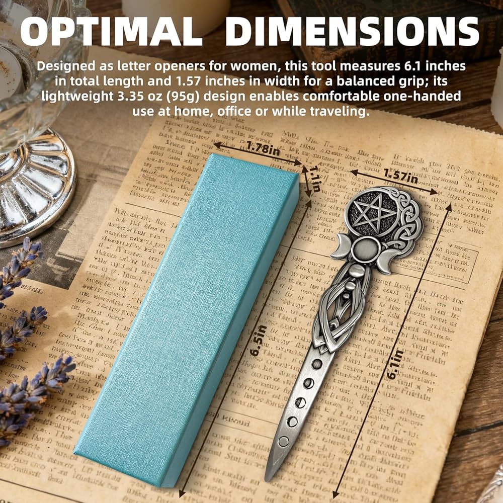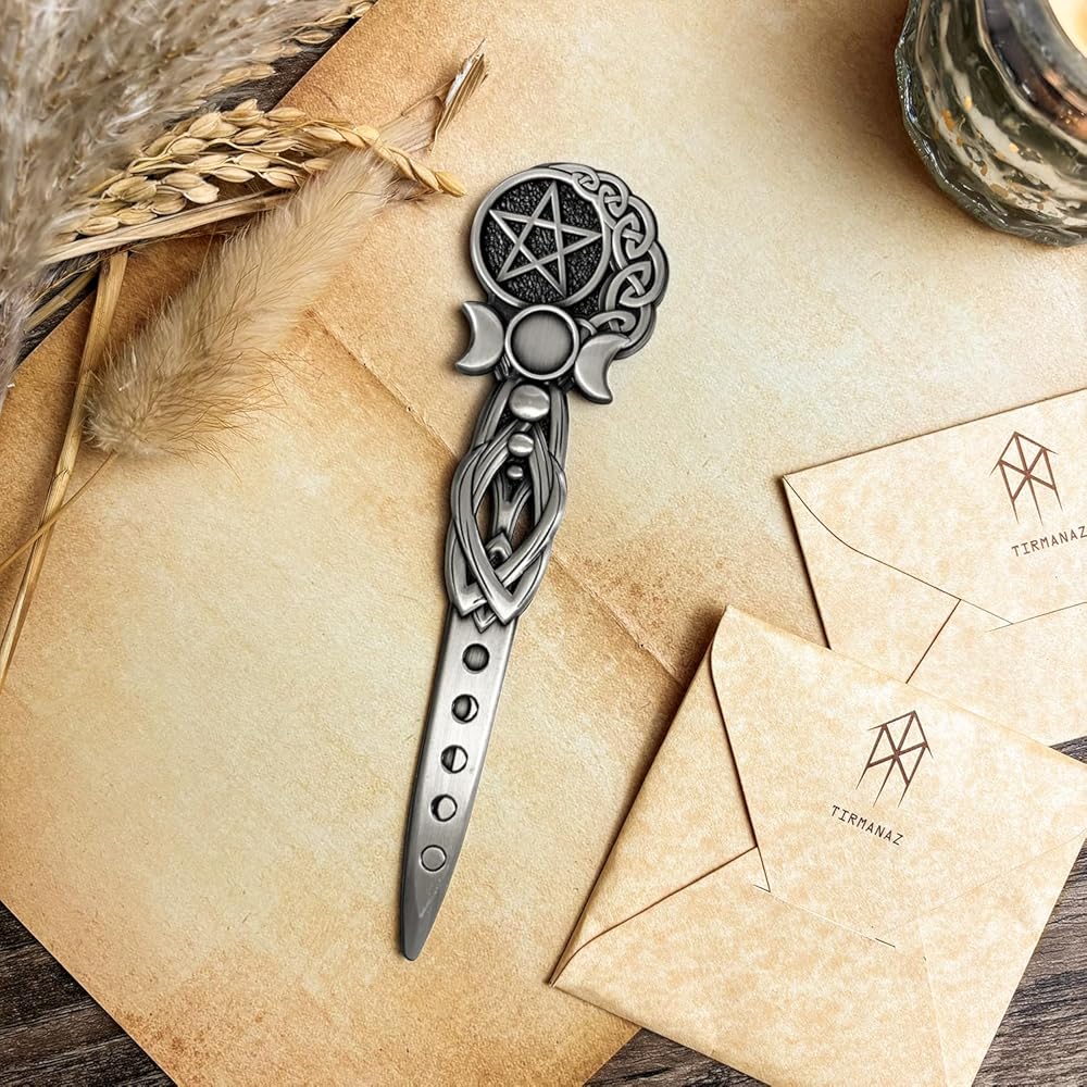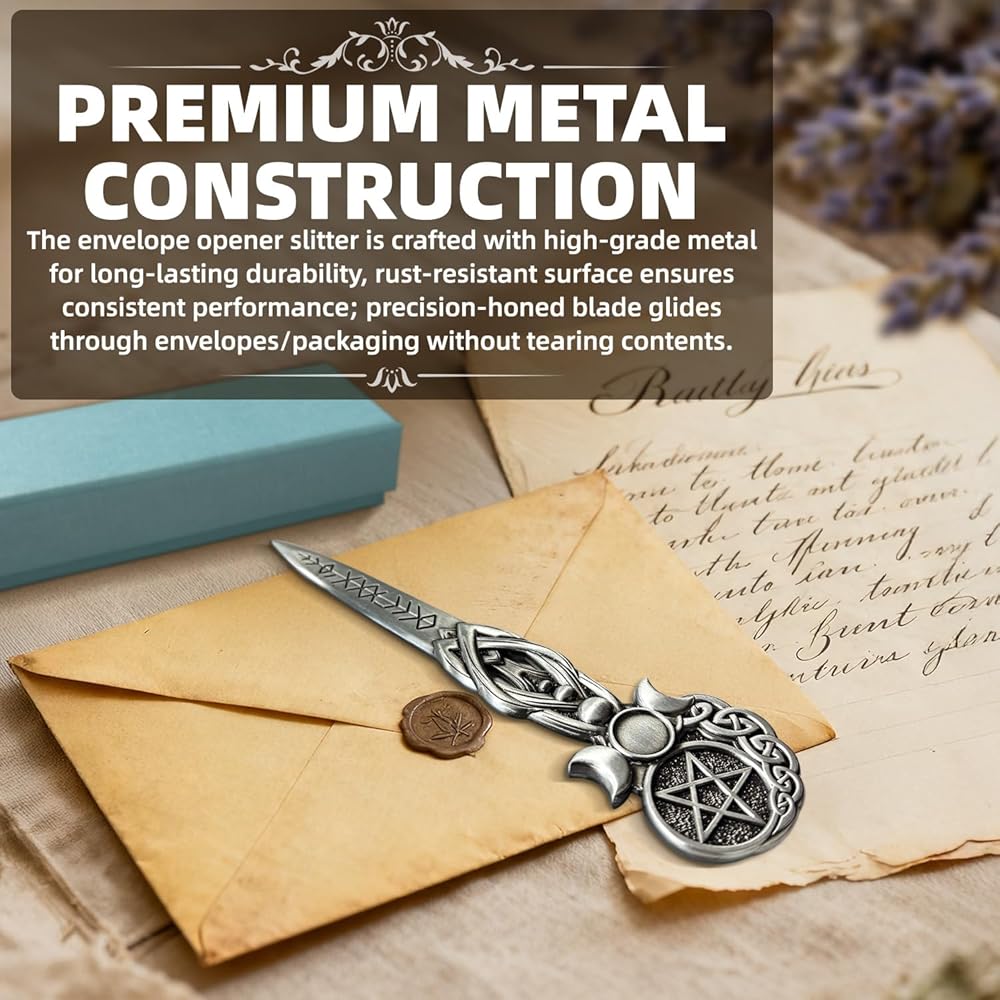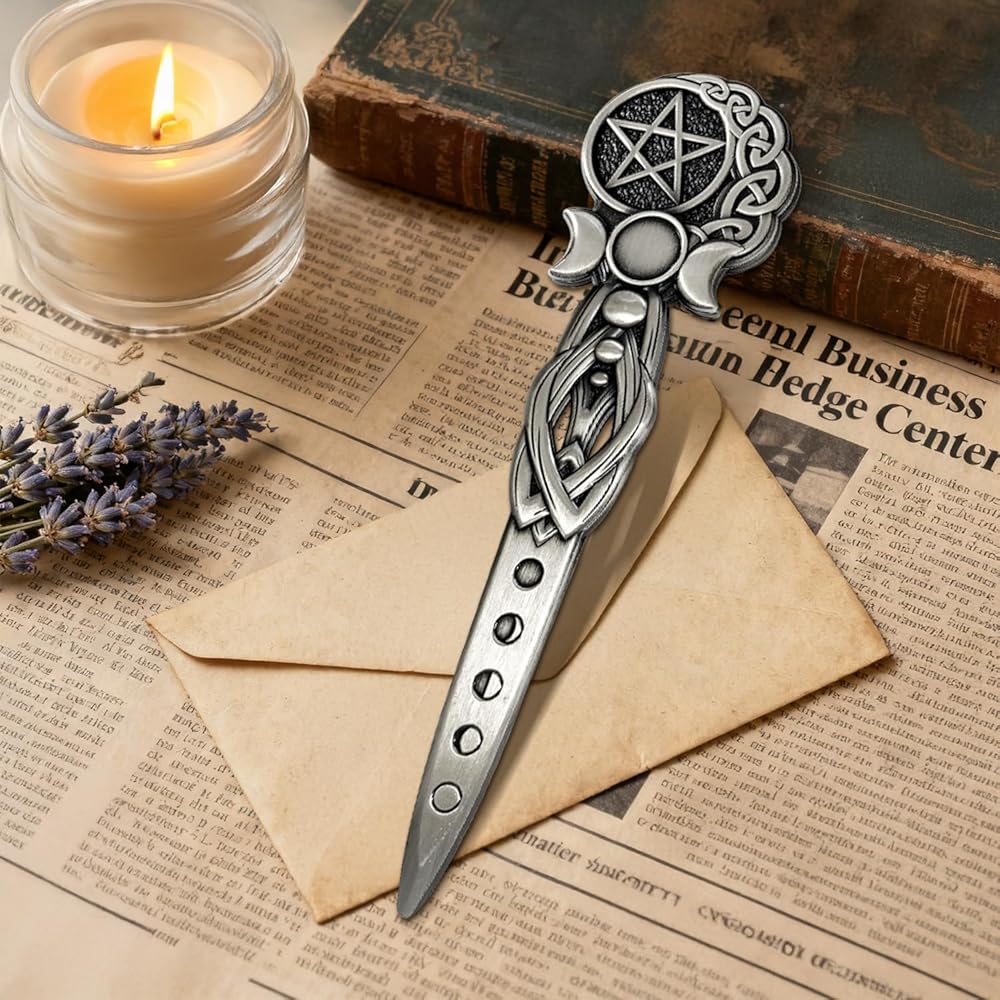 【تصميم رمز روحي】- القمر الثلاثي والخماسي المحفور بشكل معقد مما يخلق طاقة مقدسة، فتاحة البريد المعدنية مثالية لممارسي الويكا وعشاق التاروت والباحثين الروحيين.