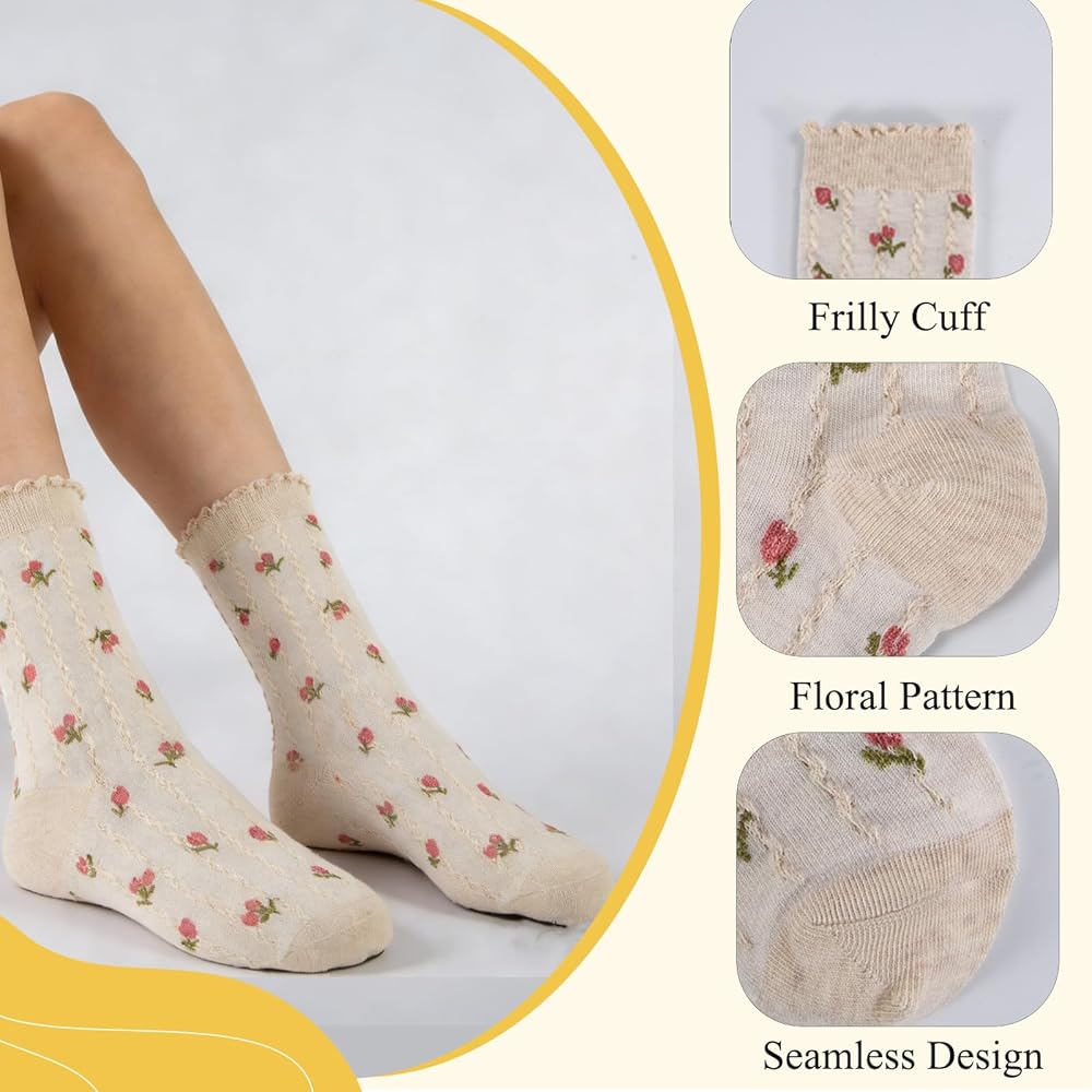 Design: Vintage inspired flower socks for womens with delicate lettuce-edge ruffles for a sweet, cottagecore aesthetic.