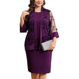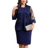 المزايا: طقم فستان مكون من قطعتين بمقاس كبير، سترة بأكمام 3/4 زهور ثلاثية الأبعاد، فستان بدون أكمام، طول متوسط، صورة ظلية جذابة.