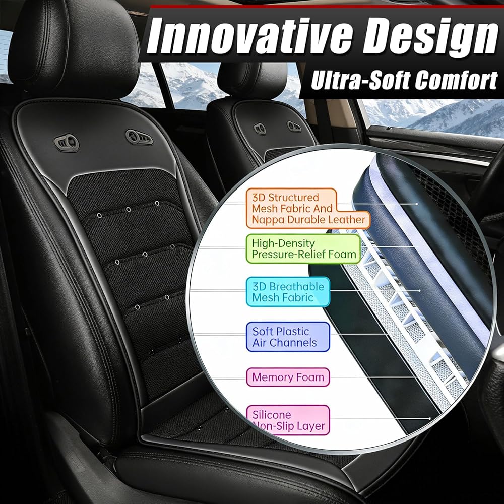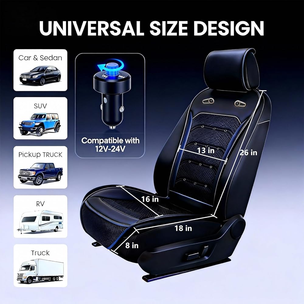 【ملاءمة عالمية، سهلة التركيب】وسادة مقعد تبريد للسيارة تناسب المركبات 12 فولت - 24 فولت بما في ذلك السيارة وسيارات الدفع الرباعي والشاحنات وRV. يستغرق التثبيت 4 خطوات بسيطة فقط بدون أدوات إضافية. أغطية مقاعد السيارة الرائعة تظل ثابتة في مكانها، مما يسمح لك بالاستمتاع بقيادة مريحة وخالية من القلق في كل مرة.