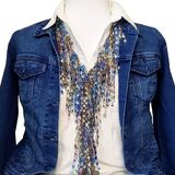 Love this blue Scarf Necklace for Women. Blue Necklace Scarfs are a soft, beautiful finishing accessory to any outfit and often thought to be statement jewelry or chunky statement necklaces. These womens infinity scarves are lightweight and shimmer as if beaded but are made from almost-weightless metallic yarns. Ideal women's gift for Christmas and for women who love the look of a lightweight fashion scarf or long fashion statement necklace but find them too hot, bulky and heavy to wear. This scarf jewelry is a perfect travel scarf and cruise scarf. Versatile, packable and perfect for any season or occasion. Looks great with an evening dress, business outfit, denim jacket, denim dress, denim shirt, top or a pair of jeans and a T-shirt. Finish your church outfit with a Scarf Necklace to elevate your look. Easy to tie - It be worn several different ways to fit all sizes and body shapes. Lightweight scarf for women that needs no fastening and ideal for arthritic hands. No tangling either. Loop this circle scarf once, twice or three times to create different lengths. Pretty packaging in an organza satchel with styling ideas card makes it a great gift idea for her. And for travellers, make additional looks without adding bulk or weight to your travel bag! CARE - Hand wash and hang to dry. Similar to a light blue scarf women, denim infinity scarf for women, blue jean statement jewelry, jean scarf necklace, denim lace scarf, boho fringe scarf, blue fringe necklace, blue soft scarf, shredded scarf, shredded necklace, denim scarf, denim necklace, blue denim jean scarf with fringe, long necklace with fringe, fabric necklace, textile necklace, ladder yarn necklace, ladder yarn scarf, ribbon necklace, ribbon scarf, lace scarf, lace necklace, lace shawl, multi strand necklace, multi layer collar Denim and diamonds necklace, fringe scarf necklace, glitter infinity scarf, blue neck scarf, silk scarf