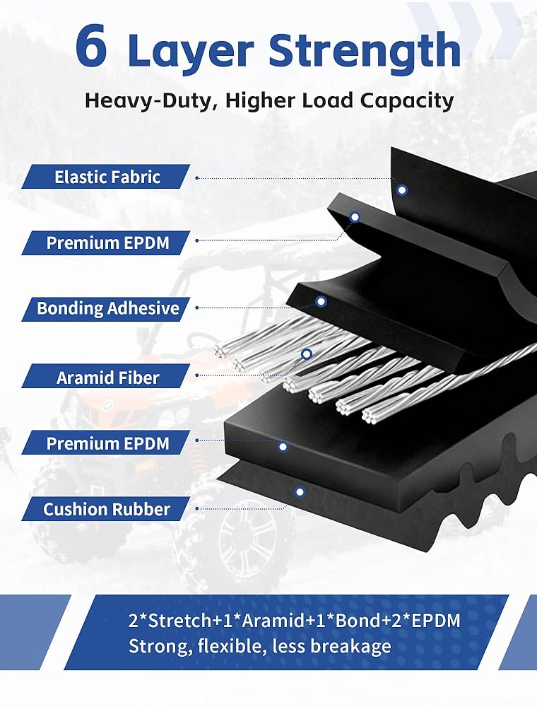 【حزام مركب من 6 طبقات】يتميز حزام EPDM CVT الخاص بنا بتصميم من 6 طبقات، يتفوق على البدائل المكونة من 5 طبقات في الثبات وقدرة التحميل. تعمل الطبقة الإضافية على تعزيز قوة الشد ومقاومة الصدمات، مما يمنع التشوه تحت الأحمال الثقيلة. إنه يعزز مقاومة التآكل ويقلل الانزلاق، مما يوفر عمر خدمة أطول ونقل طاقة أكثر موثوقية لمغامرات مكثفة على الطرق الوعرة.