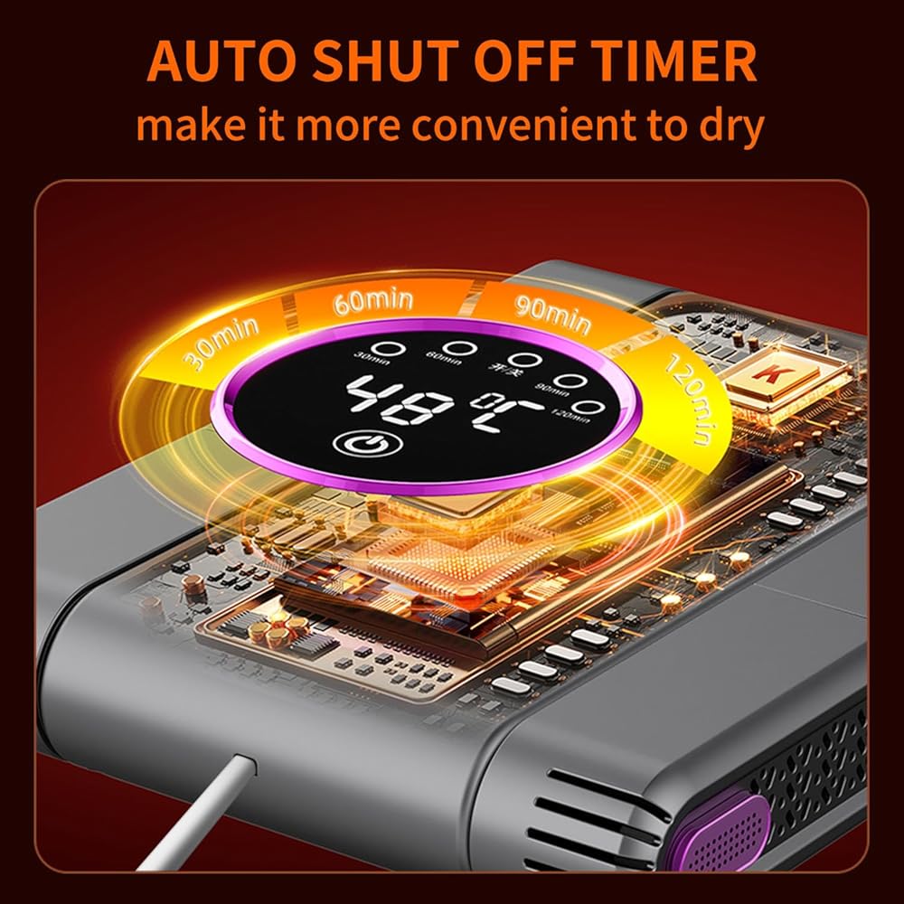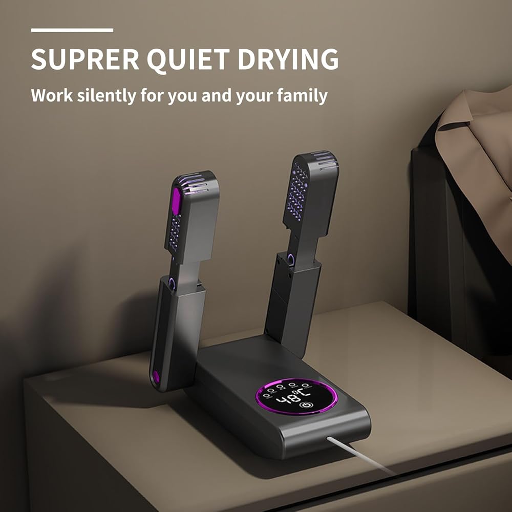 【Intelligent Timer】The electric shoe dryer offers 4 preset automatic shutoff settings and 1 manual shutoff setting. The automatic shutoff can be set to 30 minutes, 60 minutes, 90 minutes, and 120 minutes. The manual setting has no time limit, allowing you to turn off the dryer when needed. Set different working times for different types of shoes and easy to reduce power consumption. (Note: The "48 °C" in the timer is for decorative purposes only and does not represent temperature.)