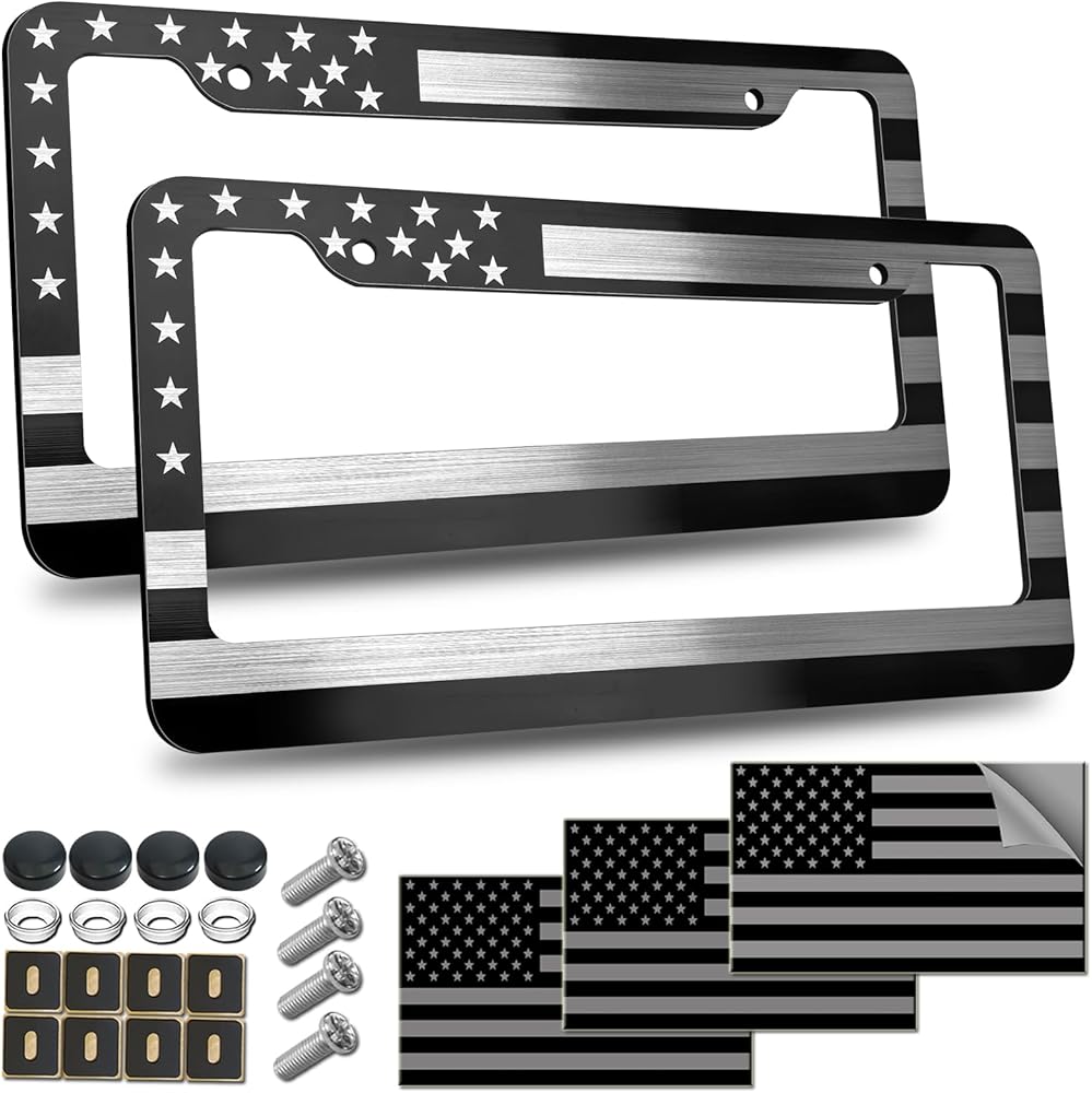 • تشمل العبوة: 2 إطار لوحة ترخيص بعلم الولايات المتحدة الأمريكية، 3 ملصقات لوحة قياسية، 8 براغي بأغطية سوداء، و8 وسادات مضادة للاهتزاز - مما يضمن تركيبًا آمنًا وخاليًا من الاهتزاز
