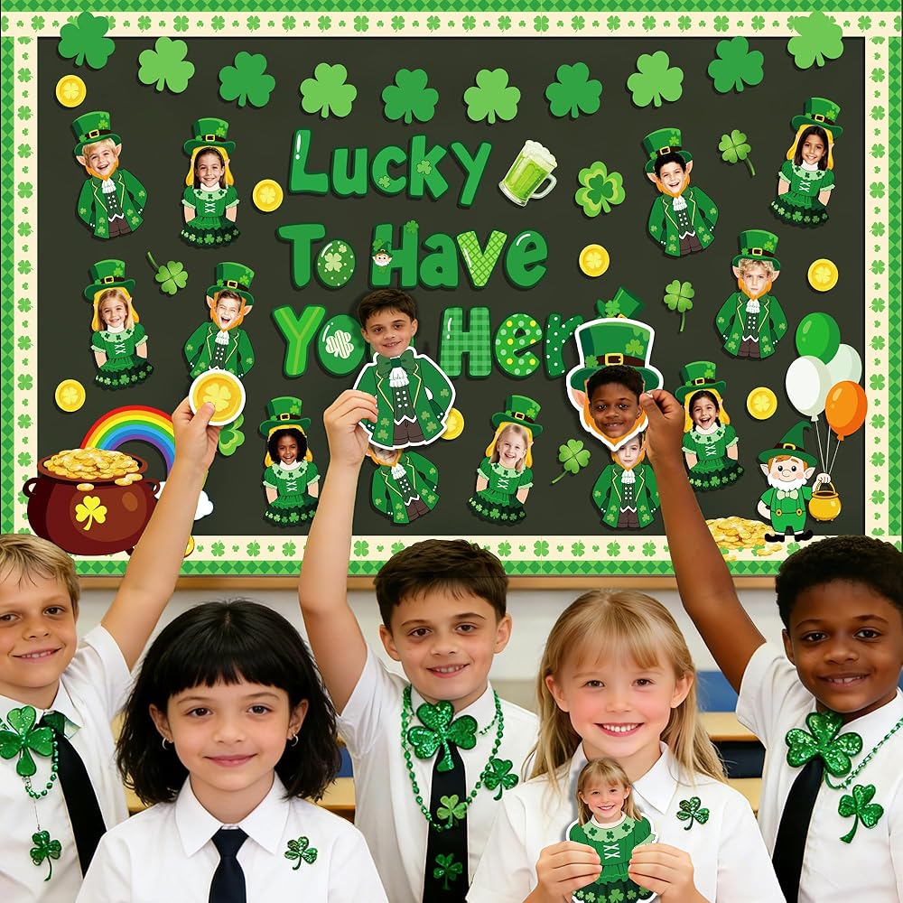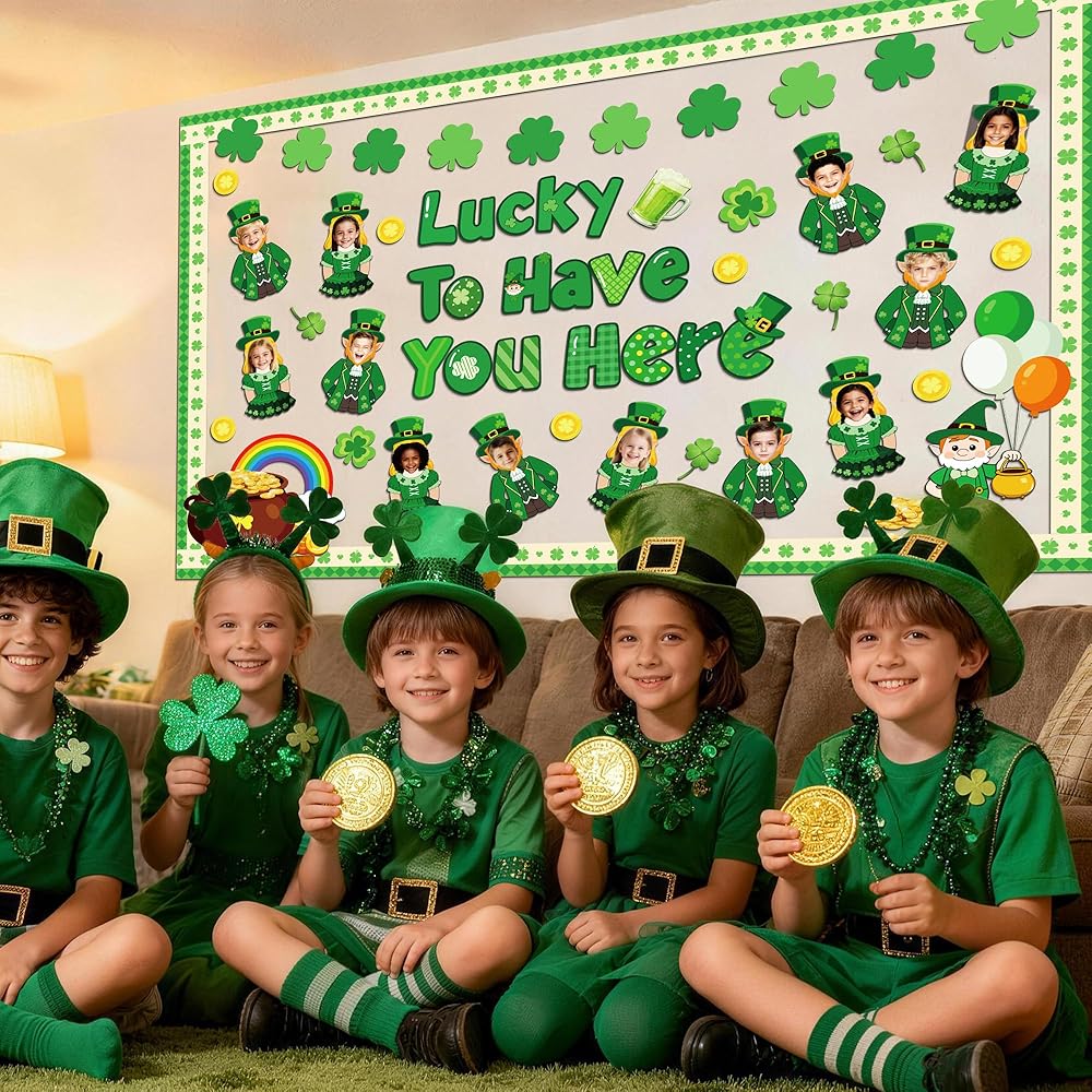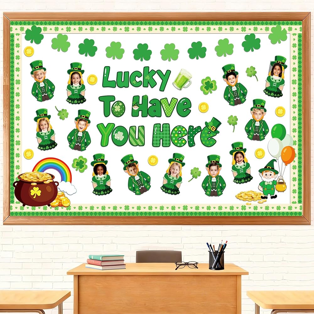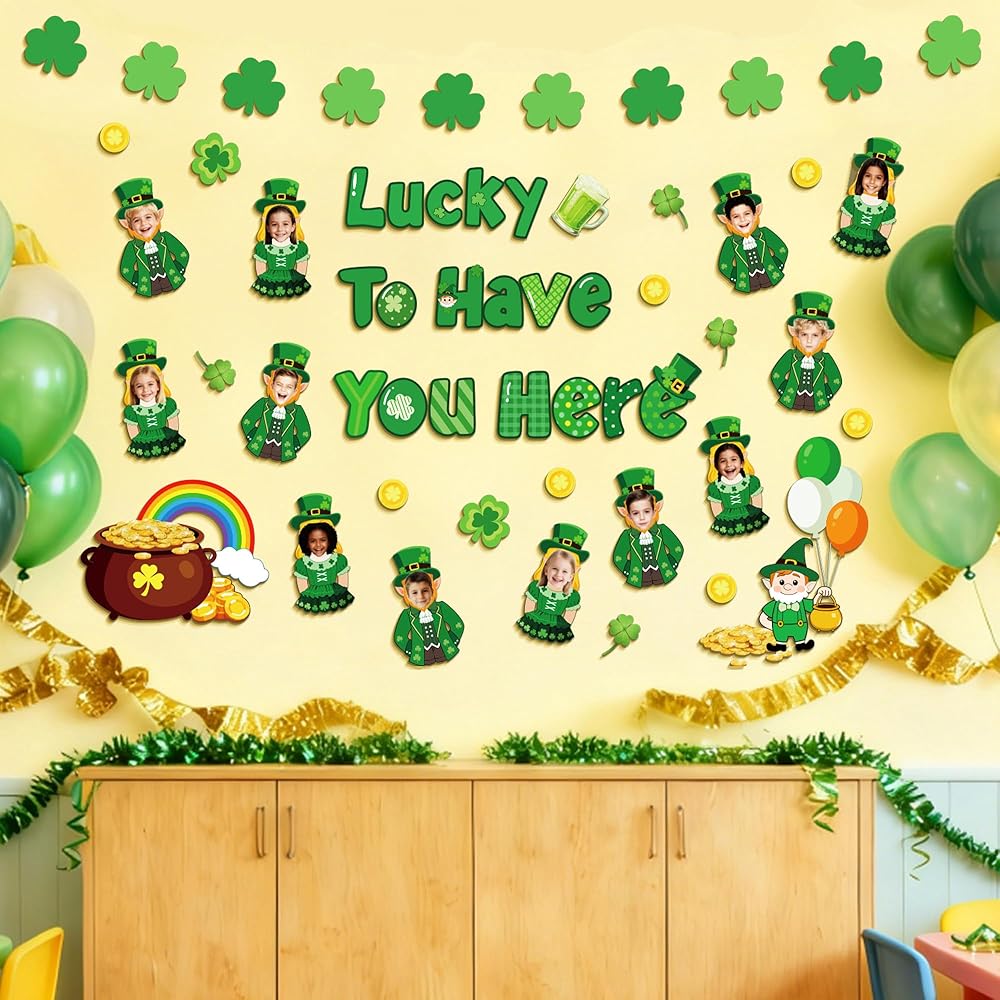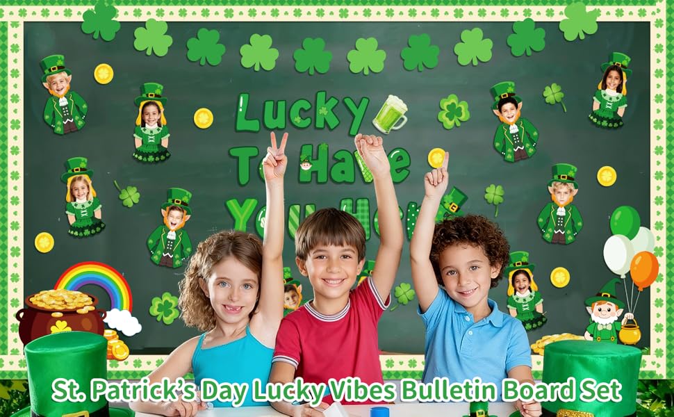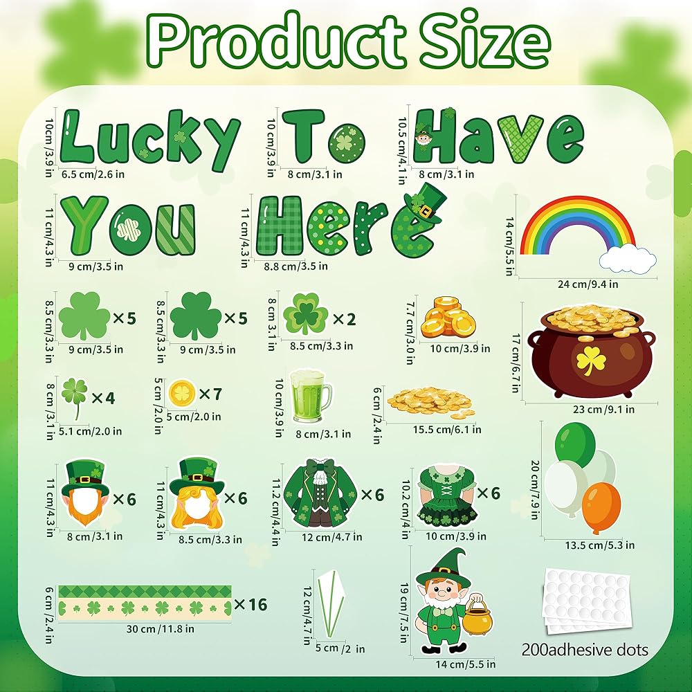 تصميم ممتاز: تتميز مجموعة ديكورات لوحة الإعلانات الخاصة بيوم القديس باتريك بموضوع ديكورات الجني التي تتضمن العديد من القديس. عناصر يوم باتريك، والجذام اللطيف، والعملات الذهبية، وقوس قزح، والبرسيم المحظوظ، ووعاء من الذهب والنفل ستضفي جوًا مبهجًا لحفلة القديس باتريك، وستجعل عبارة "Lucky To Have You Here" الطلاب يهتفون ويضحكون