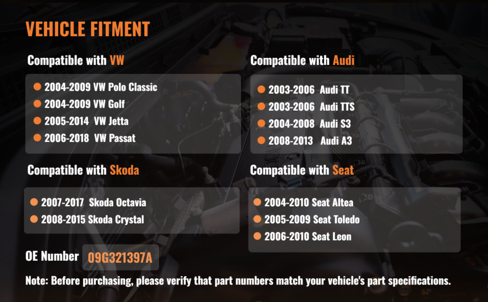• المركبات المتوافقة: متوافقة مع VW Polo Classic 2004-2009، Jetta 2005-2014، Golf 2004-2009، Passat؛ متوافق مع أودي A3 2008-2013، S3 2004-2008، TT 2003-2006، TTS؛ متوافق مع سكودا اوكتافيا 2007-2017، كريستال 2008-2015؛ ومتوافق مع سيات ألتيا 2004-2010، ليون 2006-2010، توليدو 2005-2009
